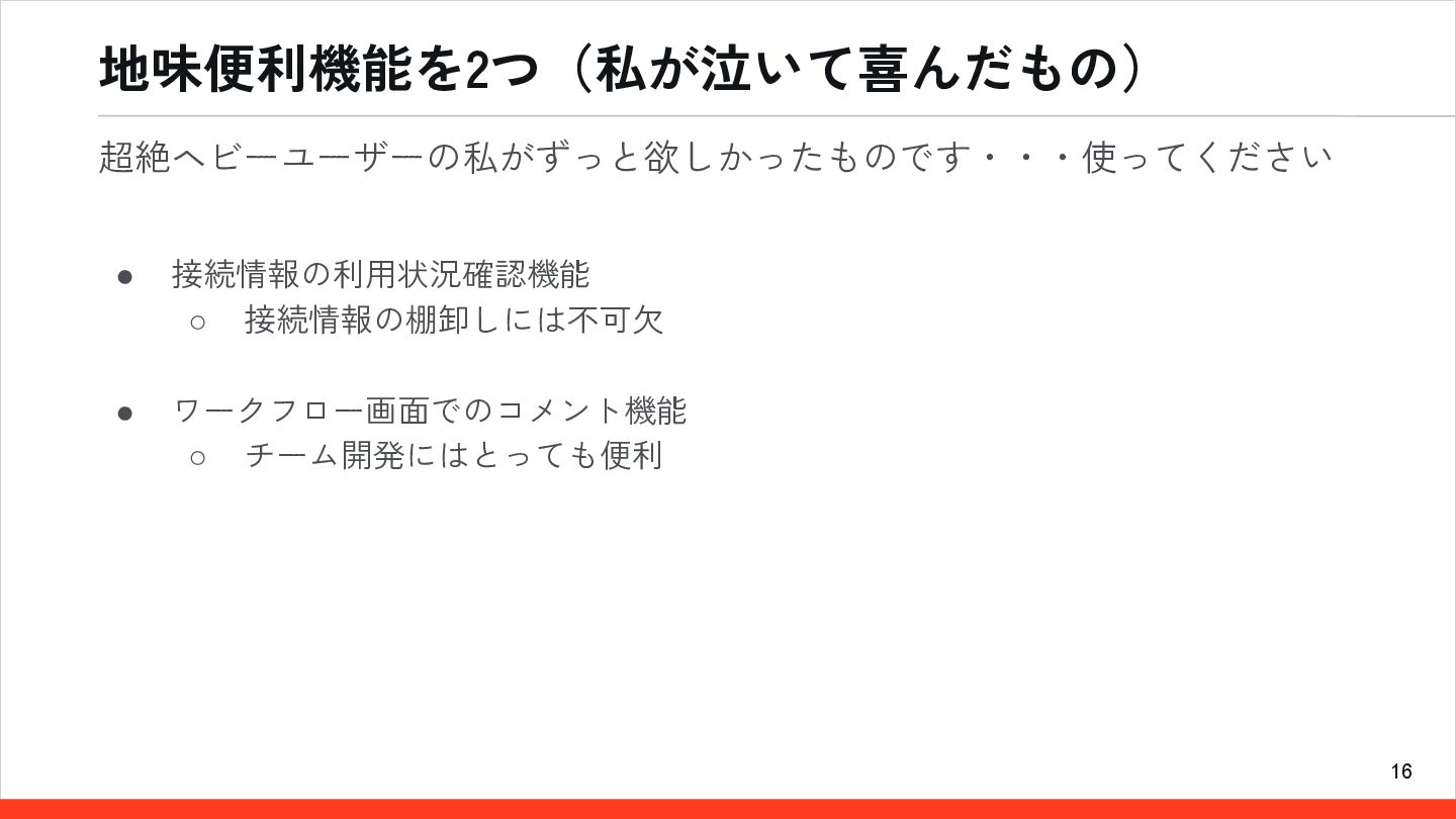 16 地味便利機能を2つ(私が泣いて喜んだもの) • 接続情報の利用状況確認機能 ◦ 接続情報の棚卸しには不可欠 • ワークフロー画面でのコメント機能 ◦ チーム開発にはとっても便利