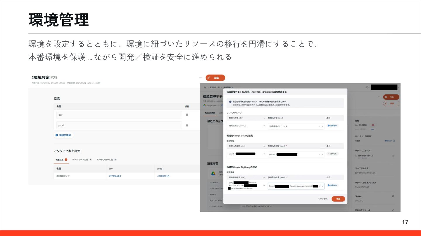 17 環境管理 環境を設定するとともに、環境に紐づいたリソースの移行を円滑にすることで、 本番環境を保護しながら開発/検証を安全に進められる