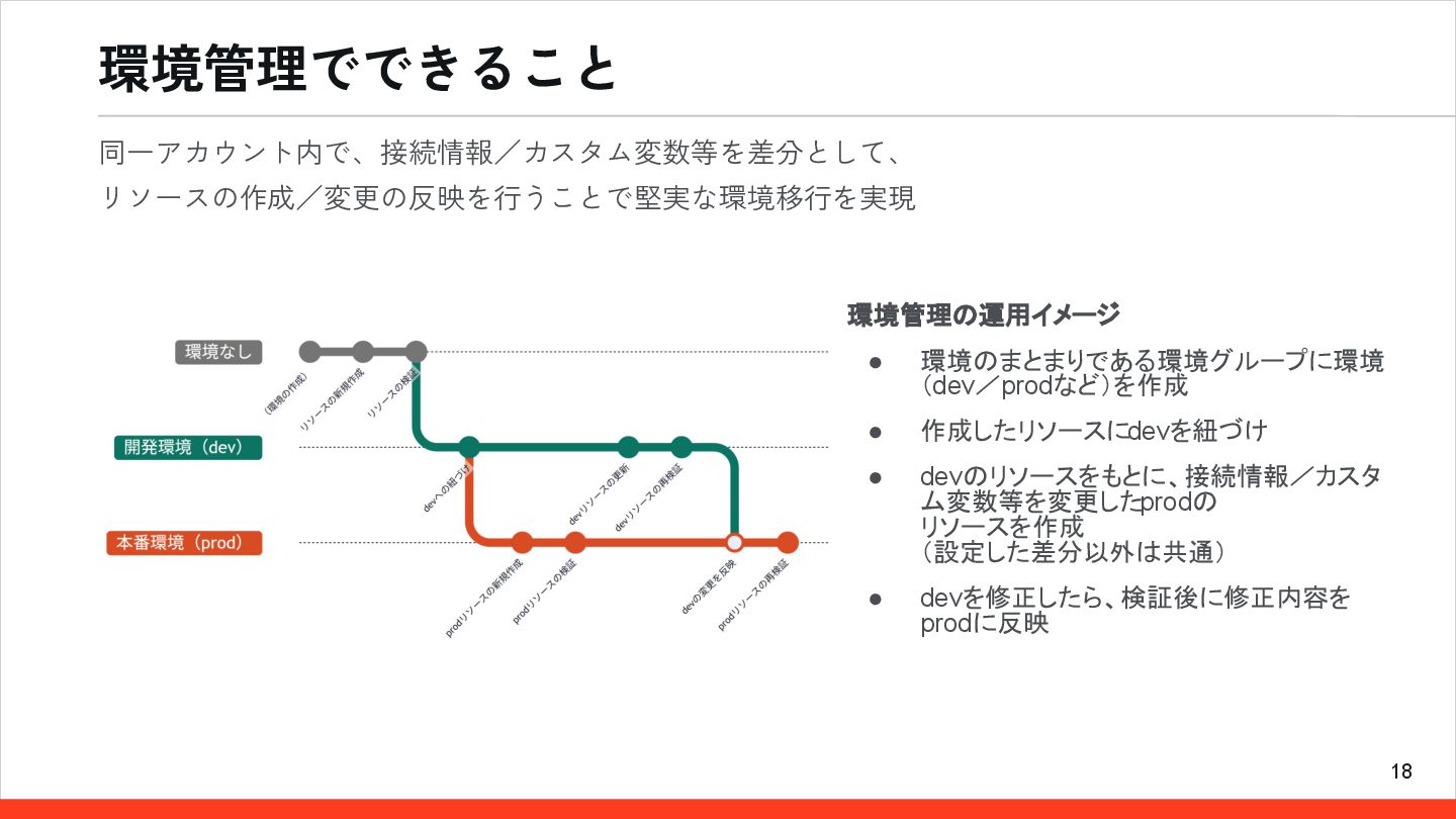 ム変数等を変更したprodの リソースを作成 (設定した差分以外は共通) • devを修正したら、検証後に修正内容を prodに反映 同一アカウント内で、接続情報/カスタム変数等を差分として、 リソースの作成/変更の反映を行うことで堅実な環境移行を実現