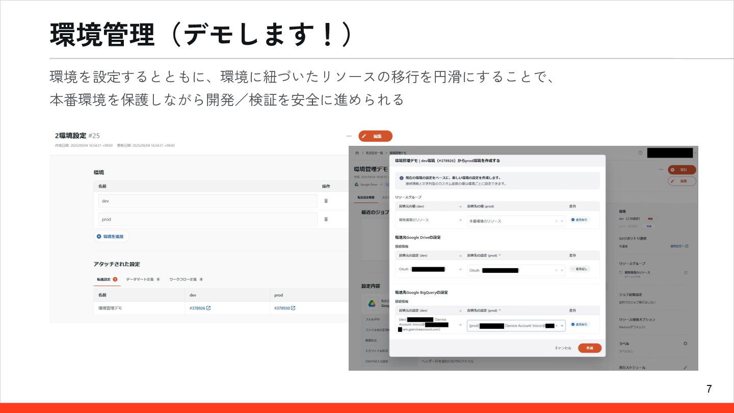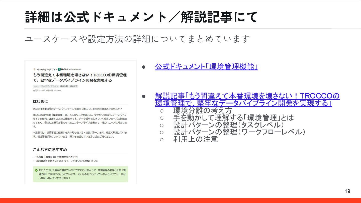 19 詳細は公式ドキュメント/解説記事にて • 公式ドキュメント「環境管理機能」 • 解説記事「もう間違えて本番環境を壊さない!TROCCOの 環境管理で、堅牢なデータパイプライン開発を実現する」 ◦ 環境分離の考え方 ◦