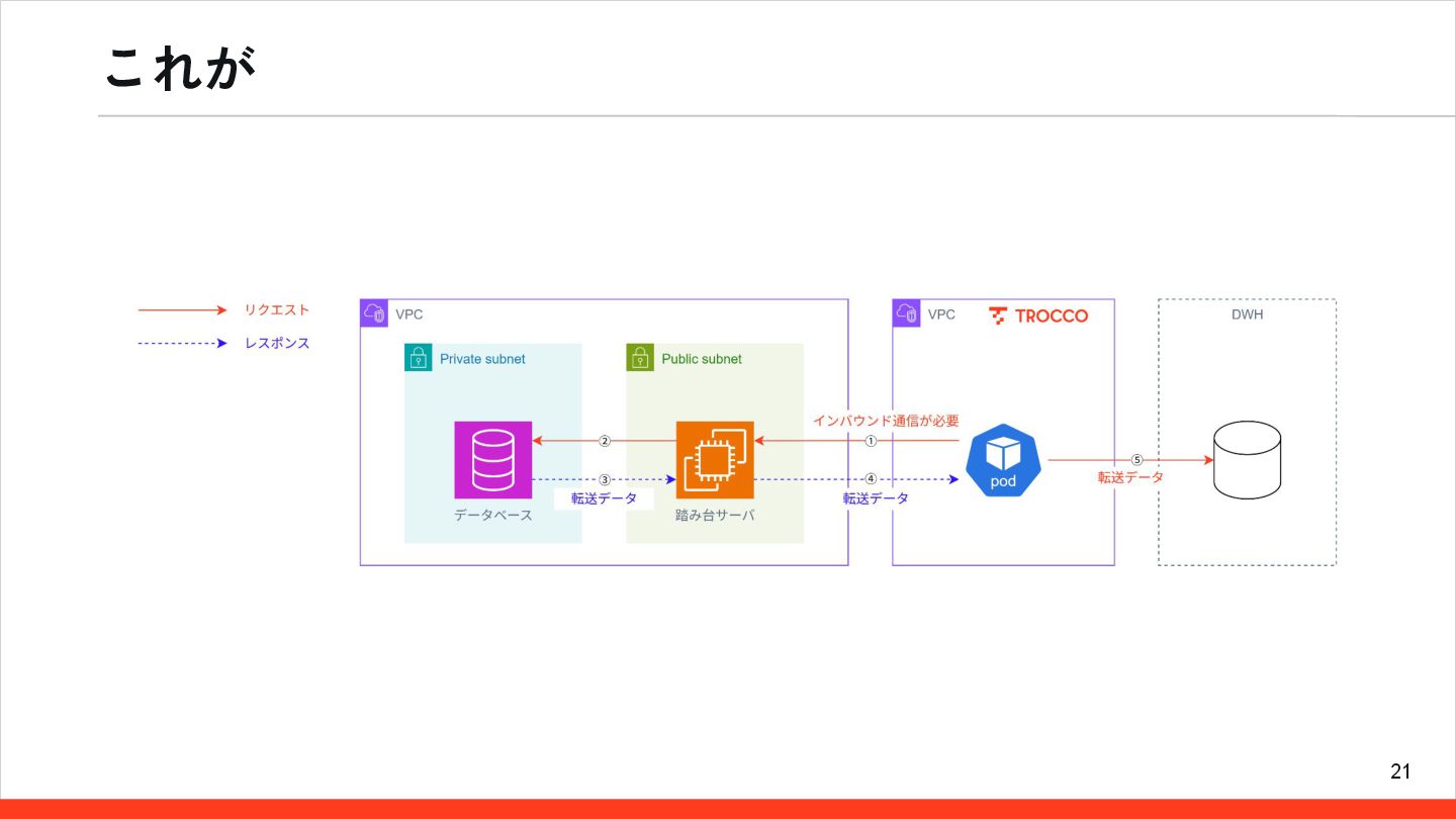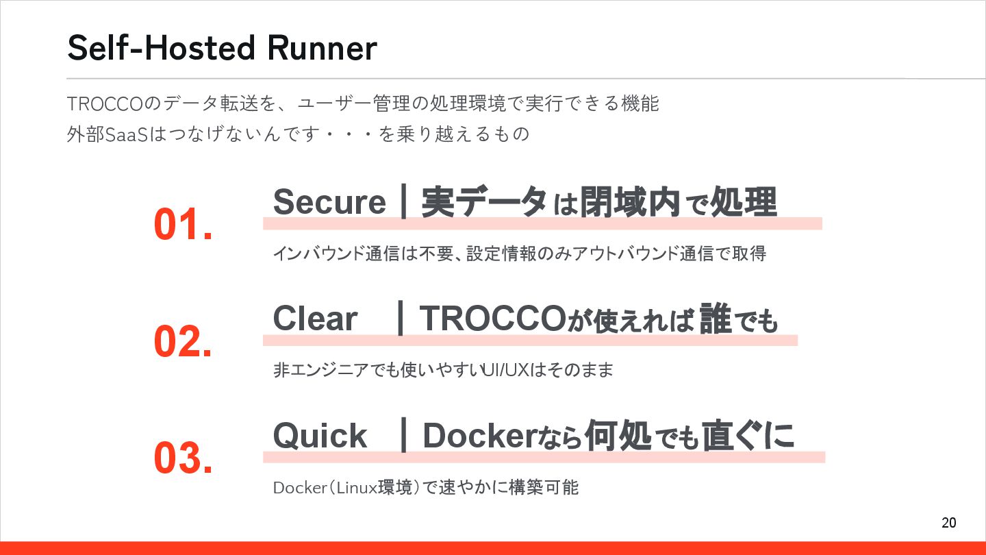 20 Self-Hosted Runner TROCCOのデータ転送を、ユーザー管理の処理環境で実行できる機能 外部SaaSはつなげないんです・・・を乗り越えるもの Secure|実データ は閉域内で処理 インバウンド通信は不要、設定情報のみアウトバウンド通信で取得 01. Clear