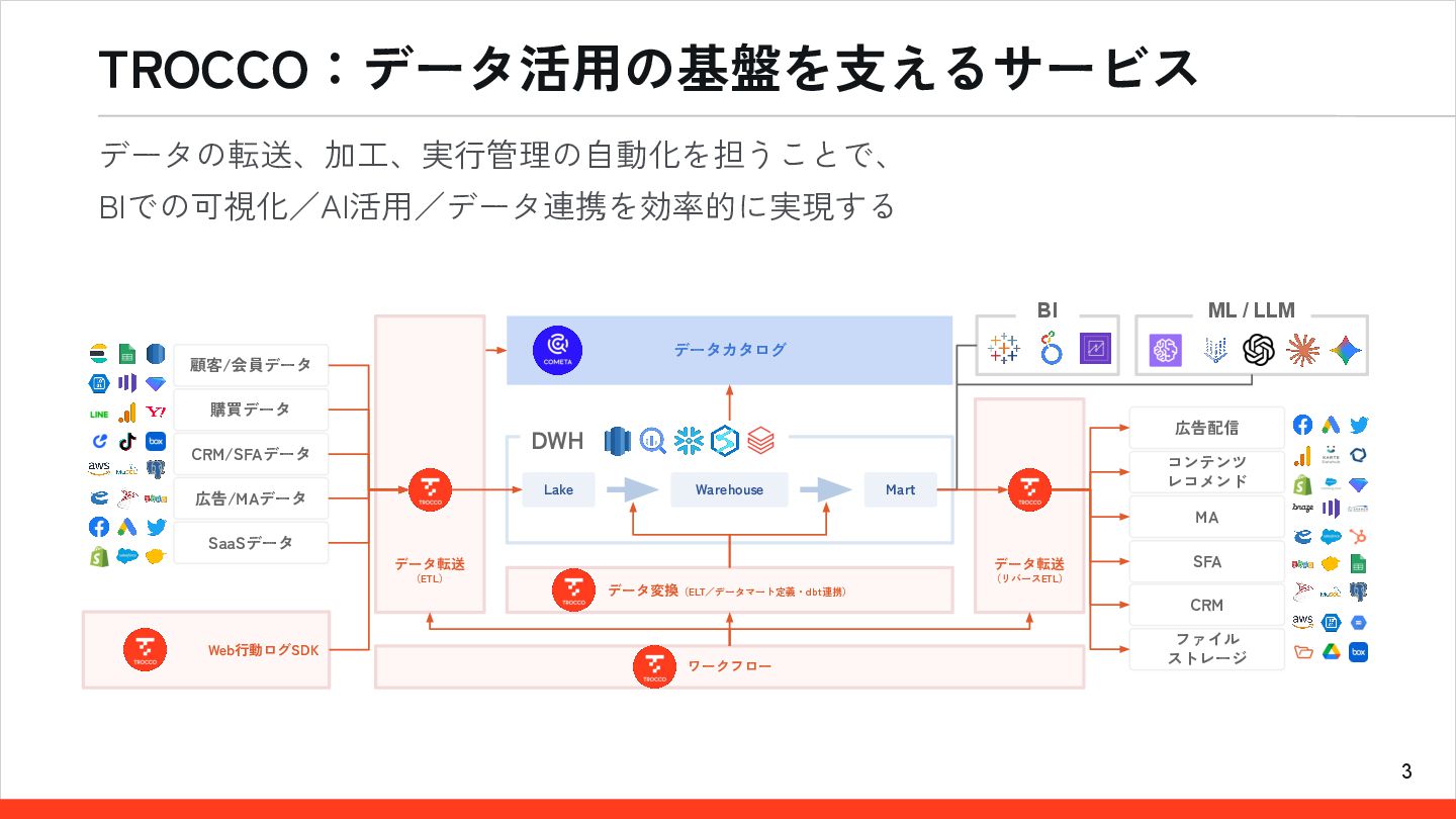 / LLM 顧客/会員データ 購買データ 広告/MAデータ CRM/SFAデータ SaaSデータ 広告配信 コンテンツ レコメンド SFA MA CRM ファイル ストレージ ワークフロー データカタログ DWH Lake Warehouse Mart データ転送 (リバースETL)