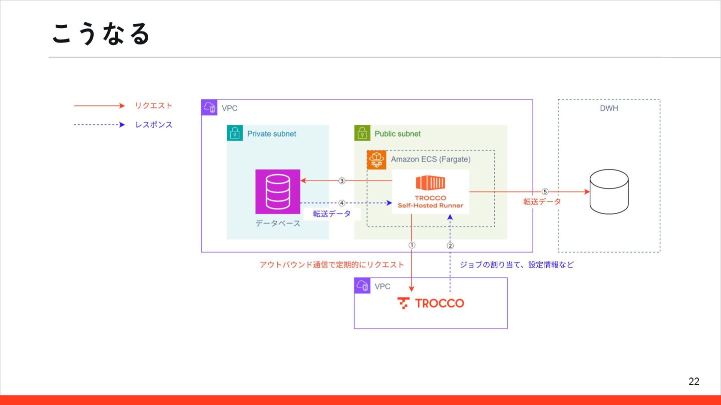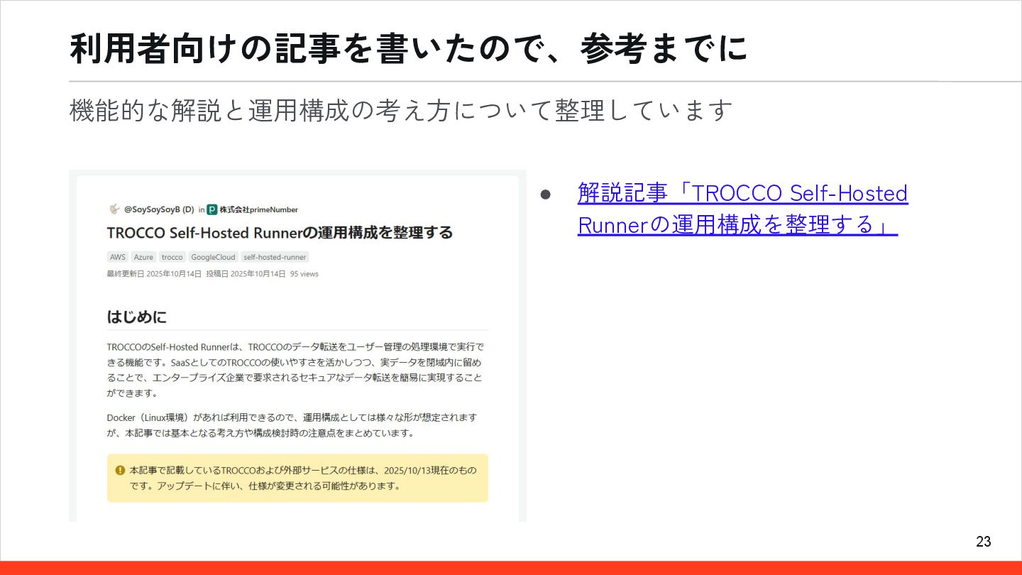 23 利用者向けの記事を書いたので、参考までに • 解説記事「TROCCO Self-Hosted Runnerの運用構成を整理する」 機能的な解説と運用構成の考え方について整理しています