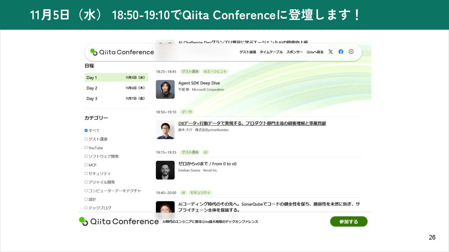 26 11月5日(水) 18:50-19:10でQiita Conferenceに登壇します!