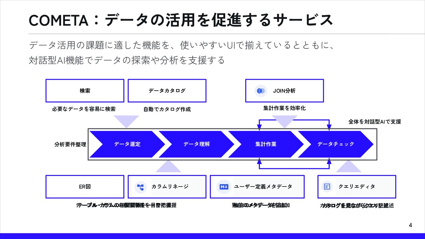 必要なデータを容易に検索 集計作業を効率化 自動でカタログ作成 テーブル・カラムの相関関係を一目で把握 独自のメタデータを追加 カタログを見ながらクエリ記述 検索 データカタログ JOIN分析 ER図 カラムリネージ ユーザー定義メタデータ クエリエディタ 全体を対話型AIで支援 データ活用の課題に適した機能を、使いやすいUIで揃えているとともに、 対話型AI機能でデータの探索や分析を支援する