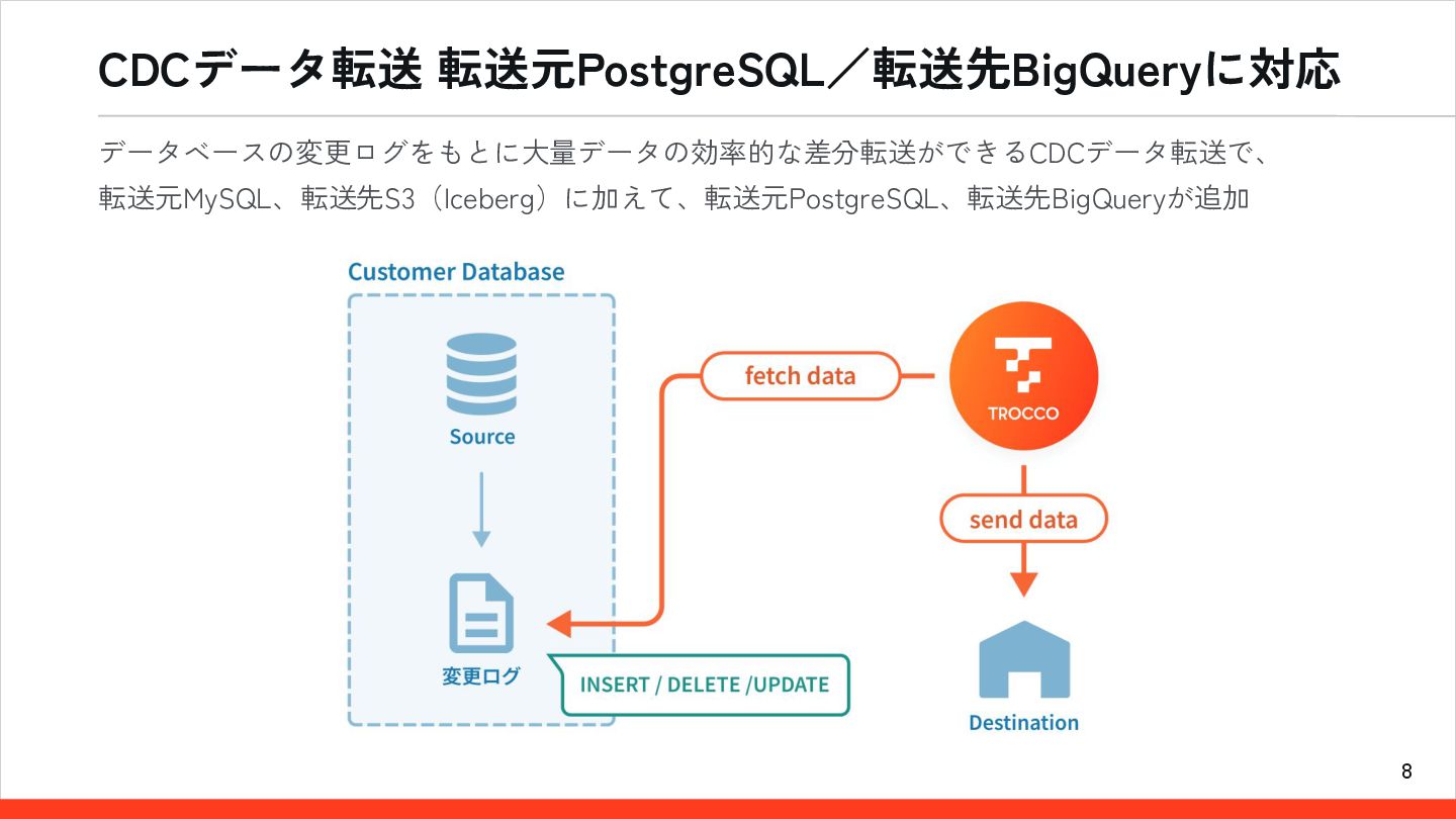 8 CDCデータ転送 転送元PostgreSQL/転送先BigQueryに対応 データベースの変更ログをもとに大量データの効率的な差分転送ができるCDCデータ転送で、 転送元MySQL、転送先S3(Iceberg)に加えて、転送元PostgreSQL、転送先BigQueryが追加