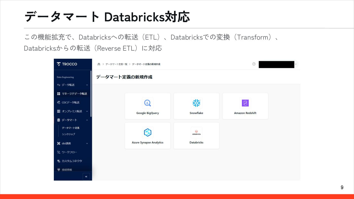 9 データマート Databricks対応 この機能拡充で、Databricksへの転送(ETL)、Databricksでの変換(Transform)、 Databricksからの転送(Reverse ETL)に対応