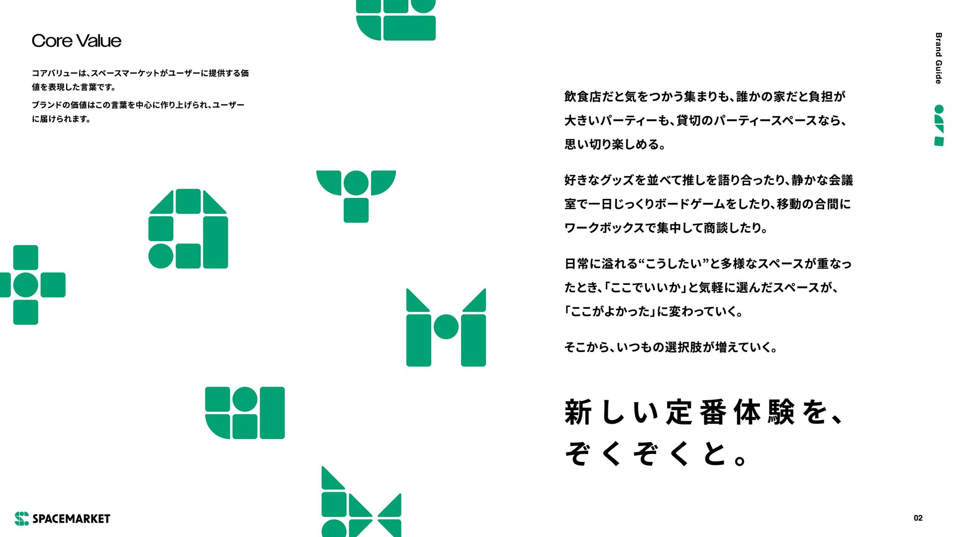 日常に溢れる“こうしたい”と多様なスペースが重なっ たとき、 「ここでいいか」 と気軽に選んだスペースが、 「ここがよかった」 に変わっていく。 そこから、 いつもの選択肢が増えていく。 新しい定番体験を、 ぞくぞくと。 Core Value コアバリューは、 スペースマーケットがユーザーに提供する価 値を表現した言葉です。 ブランドの価値はこの言葉を中心に作り上げられ、 ユーザー に届けられます。 02 Brand Guide