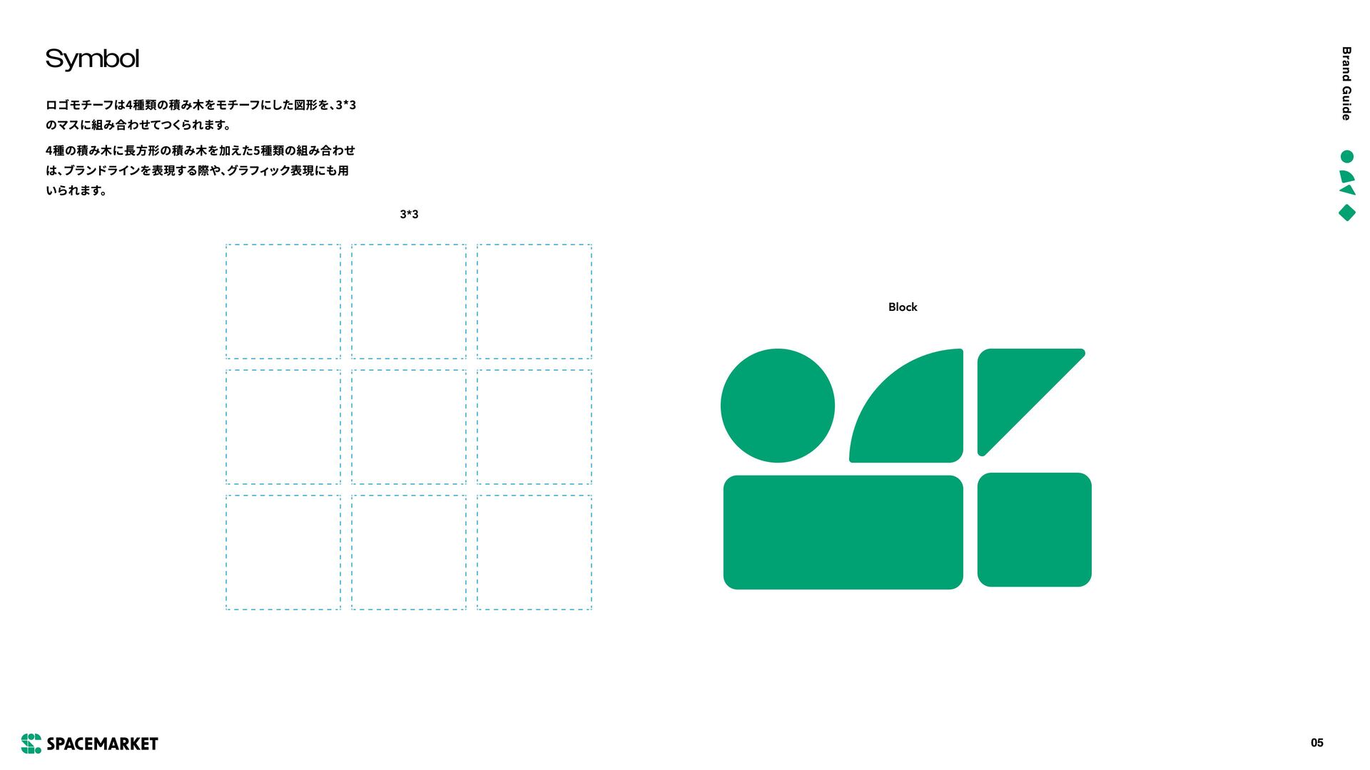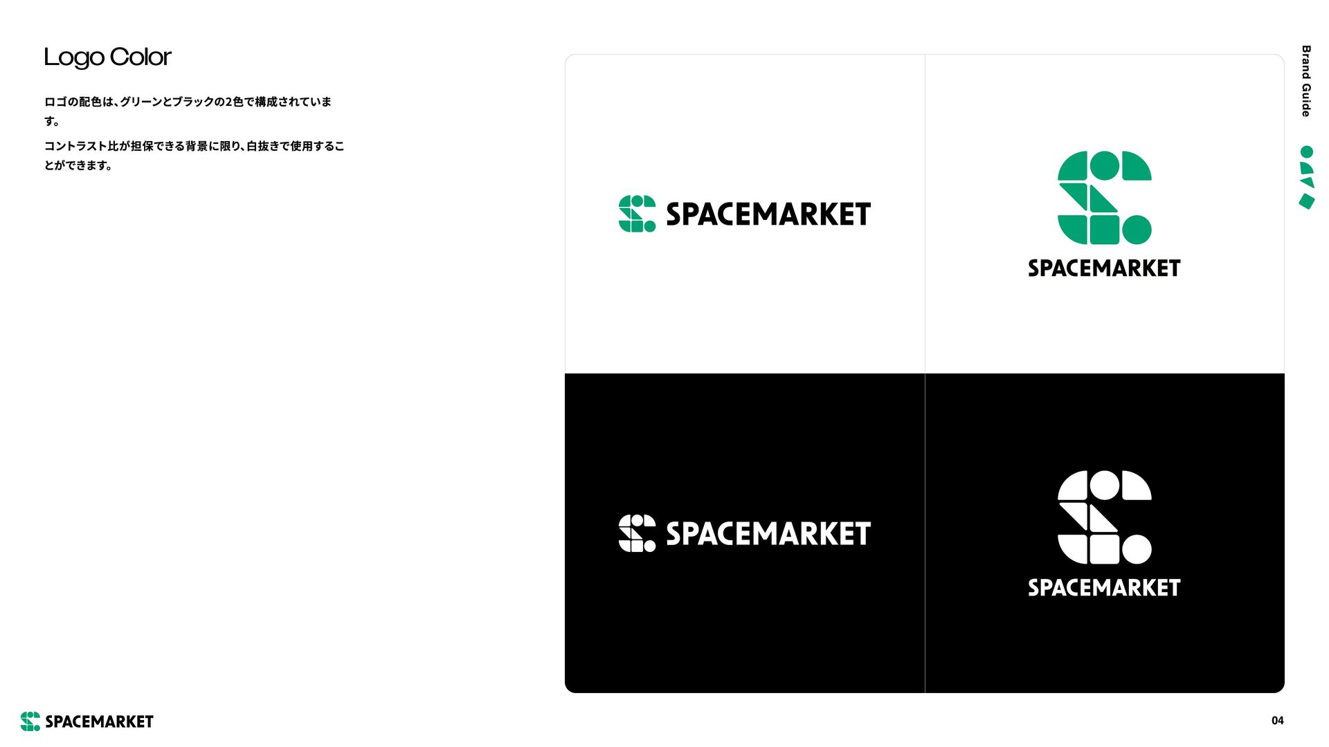 Logo ロゴマークは、 スペースマーケットの最も基本となるビジュア ルアイデンティティです。 ロゴマークとロゴタイプは、 ほとんどの場合セットで利用さ れますが、 どちらか一方で利用されることも許容されます。 03 Brand