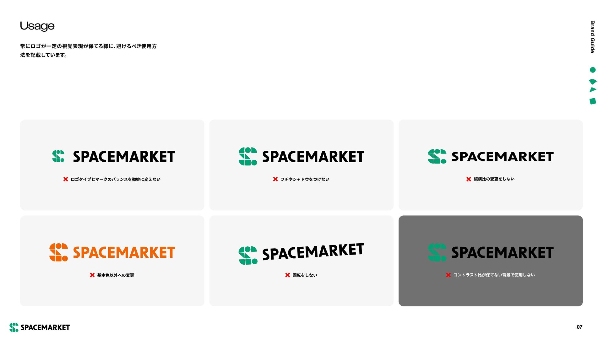 Usage 常にロゴが一定の視覚表現が保てる様に、 避けるべき使用方 法を記載しています。 ロゴタイプとマークのバランスを微妙に変えない フチやシャドウをつけない 縦横比の変更をしない 基本色以外への変更 回転をしない コントラスト比が保てない背景で使用しない
