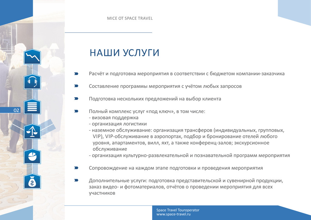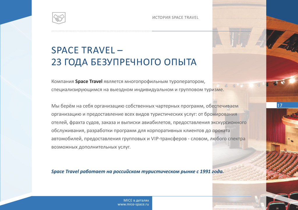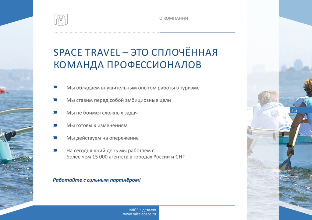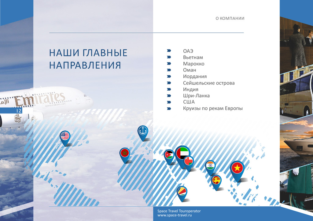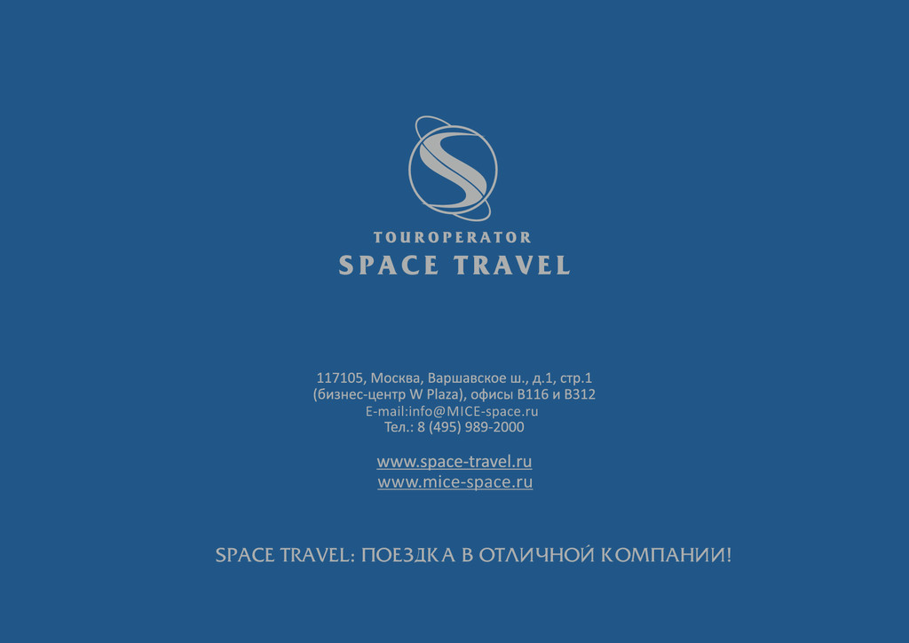 числе: Emirates, E had, Air Arabia, «Аэрофлот», «Трансаэро», Vietnam Airlines, Royal Jordanian, Royal Air Maroc, Qatar Airways, ShriLankan Airlines, Turkish Airlines, «Эль-Аль» и многие другие Известные цепочки отелей международных брендов: Mövenpick Hotels & Resorts, Ritz- Carlton, Four Seasons, Marrio , Kempinski, Hilton, Intercon nental, Radisson Blu, Banyan Tree Hotels & Resorts, Angsana Hotels & Resorts, Constance. RIU, Sofitel, Atlas Hospitality. The Jetwing. Isrotel, DAN, Fa al (включая известные бренды – Leonardo, Herods, Le Meridien, Magic), Shangri-La (Al Husn, Al Bandar, Al Waha) Партнёры и крупнейшие принимающие компании во многих странах мира: Plaza Tours (Иордания), Focus Travel (Вьетнам), HG Travel (Вьетнам), Monarch Travel (Марокко), Exo c Holidays Interna onal (Шри-Ланка), Travis (Израиль), Rubin Tourism (Израиль), Muscat Orient Tour (Оман), Mason’s Travel (Сейшелы) Space Travel Touroperator www.space-travel.ru