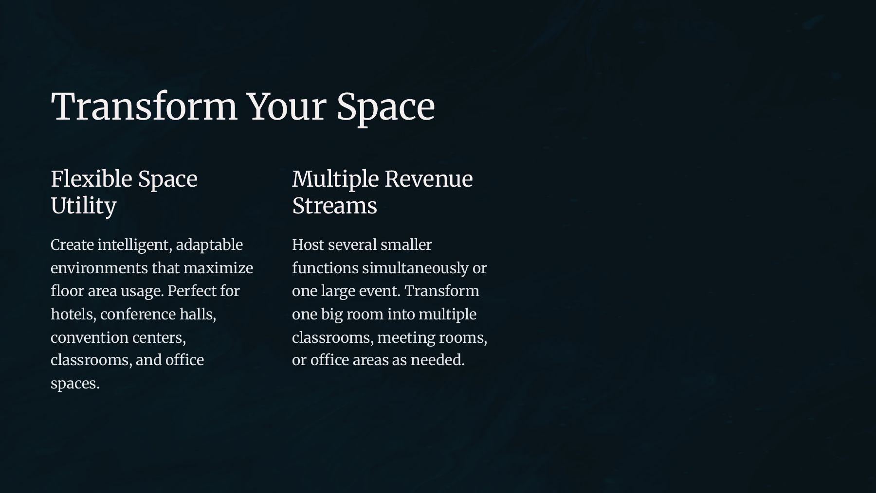 Our high-quality partitions ensure smooth operation, superior sound insulation, and modern aesthetics — providing an ideal balance of functionality and style to optimize your interiors with smart space management solutions.