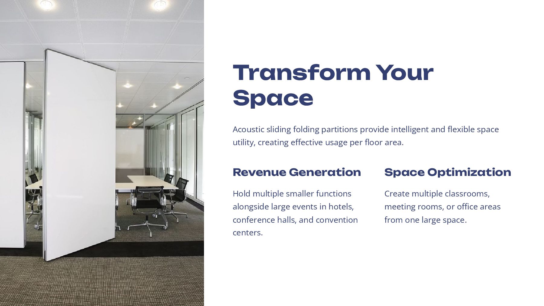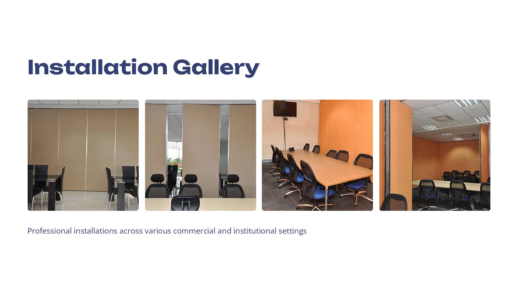 Our Acoustic Sliding Folding Partitions in PCMC are engineered to provide superior noise reduction and space management. Perfect for offices, meeting rooms, and event halls—blend performance with modern design.