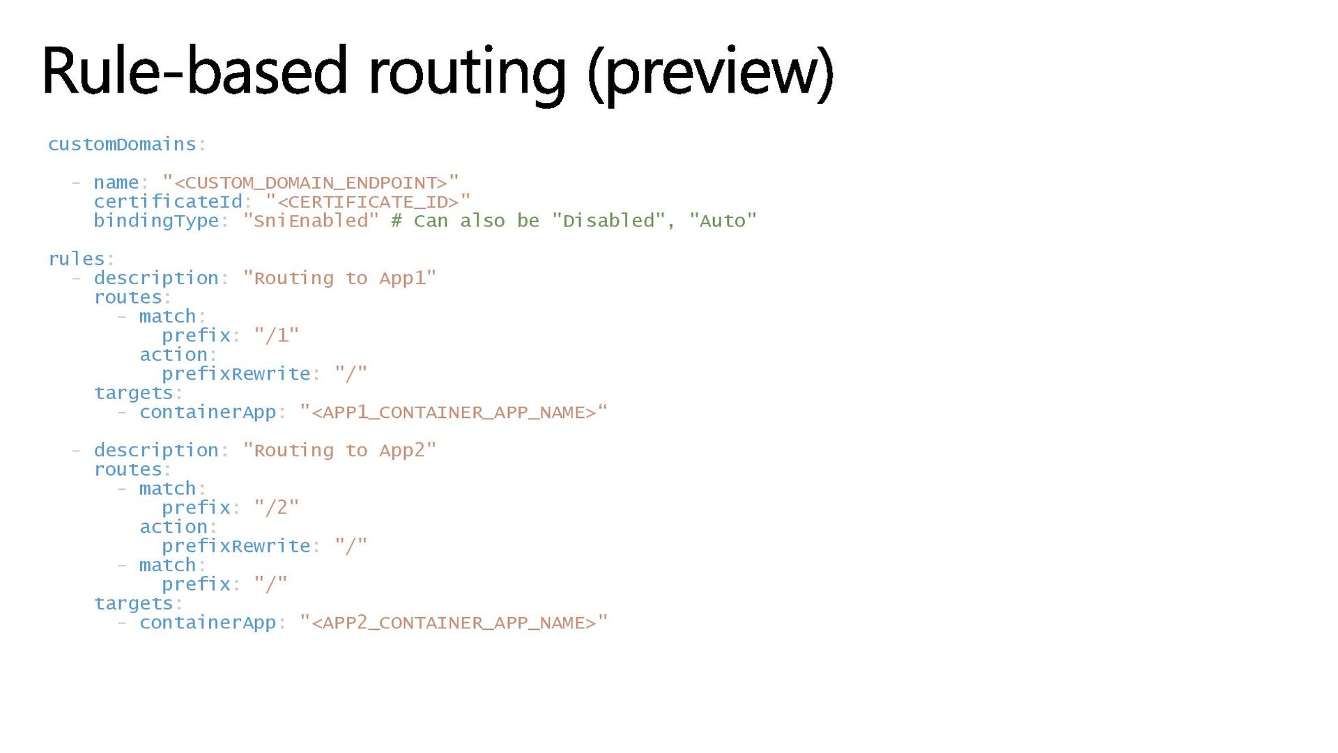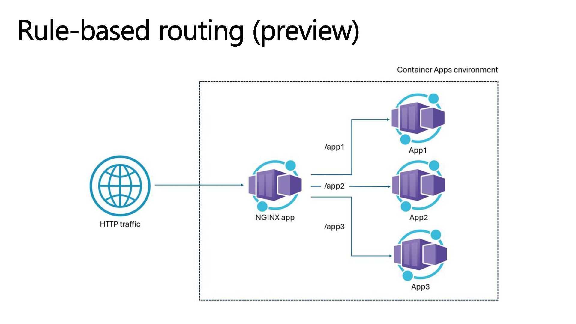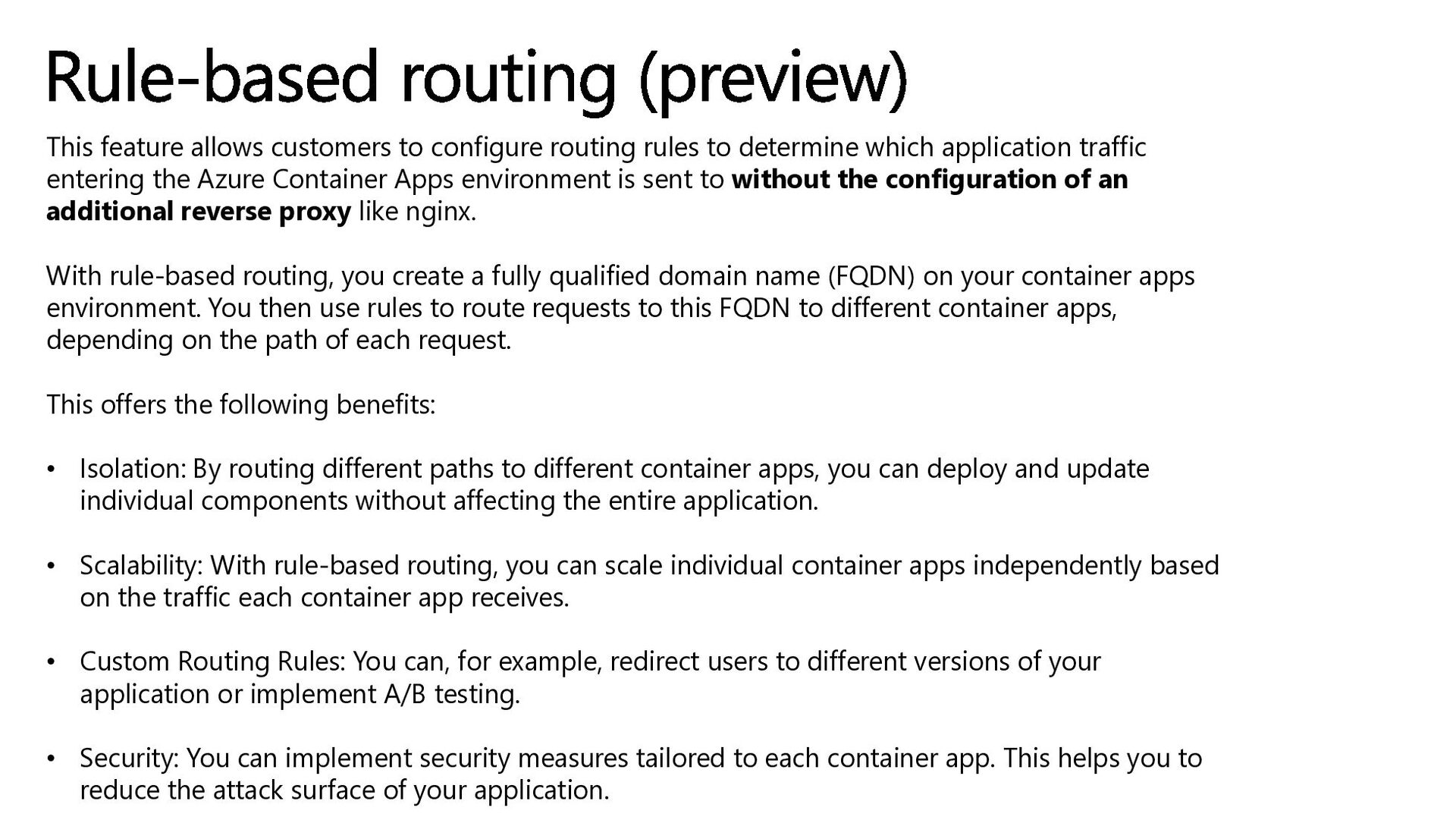 which application traffic entering the Azure Container Apps environment is sent to without the configuration of an additional reverse proxy like nginx. With rule-based routing, you create a fully qualified domain name (FQDN) on your container apps environment. You then use rules to route requests to this FQDN to different container apps, depending on the path of each request. This offers the following benefits: • Isolation: By routing different paths to different container apps, you can deploy and update individual components without affecting the entire application. • Scalability: With rule-based routing, you can scale individual container apps independently based on the traffic each container app receives. • Custom Routing Rules: You can, for example, redirect users to different versions of your application or implement A/B testing. • Security: You can implement security measures tailored to each container app. This helps you to reduce the attack surface of your application. Rule-based routing (preview)