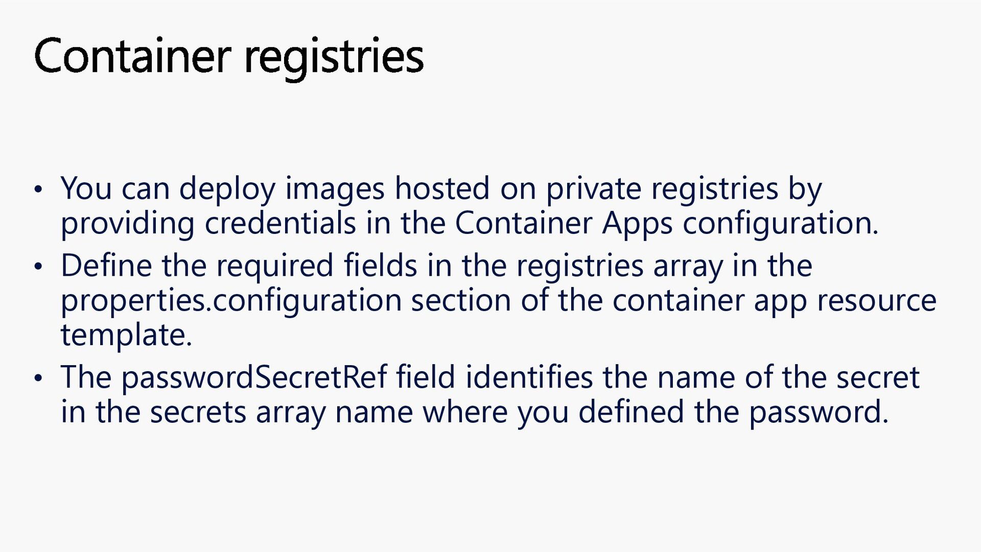 providing credentials in the Container Apps configuration. • Define the required fields in the registries array in the properties.configuration section of the container app resource template. • The passwordSecretRef field identifies the name of the secret in the secrets array name where you defined the password. Container registries