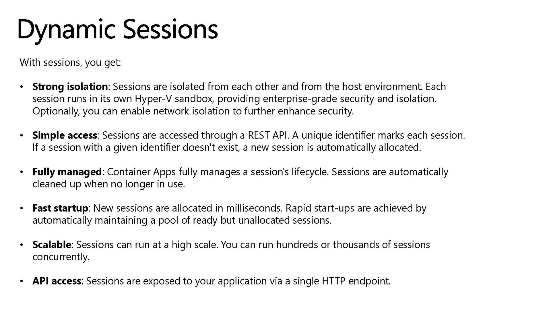 from each other and from the host environment. Each session runs in its own Hyper-V sandbox, providing enterprise-grade security and isolation. Optionally, you can enable network isolation to further enhance security. • Simple access: Sessions are accessed through a REST API. A unique identifier marks each session. If a session with a given identifier doesn't exist, a new session is automatically allocated. • Fully managed: Container Apps fully manages a session's lifecycle. Sessions are automatically cleaned up when no longer in use. • Fast startup: New sessions are allocated in milliseconds. Rapid start-ups are achieved by automatically maintaining a pool of ready but unallocated sessions. • Scalable: Sessions can run at a high scale. You can run hundreds or thousands of sessions concurrently. • API access: Sessions are exposed to your application via a single HTTP endpoint. Dynamic Sessions