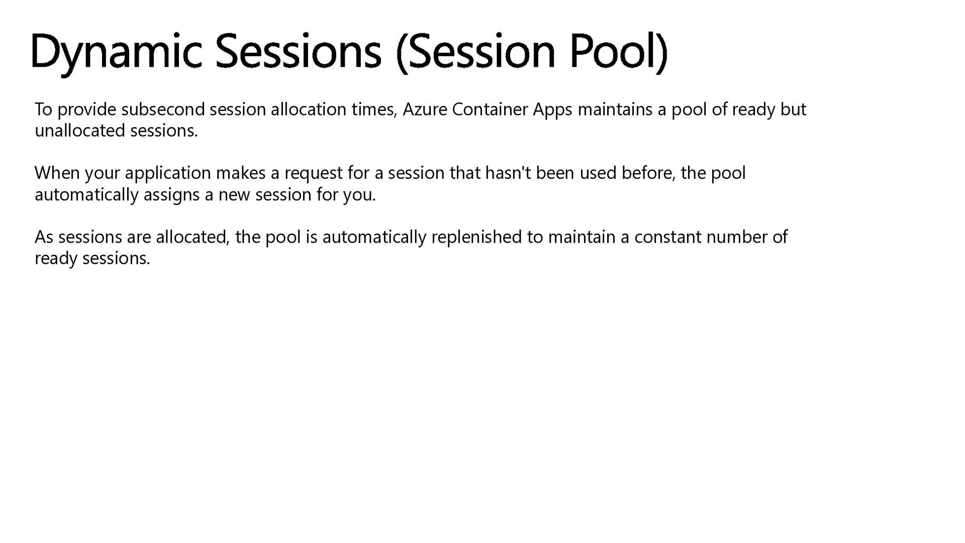 a pool of ready but unallocated sessions. When your application makes a request for a session that hasn't been used before, the pool automatically assigns a new session for you. As sessions are allocated, the pool is automatically replenished to maintain a constant number of ready sessions. Dynamic Sessions (Session Pool)