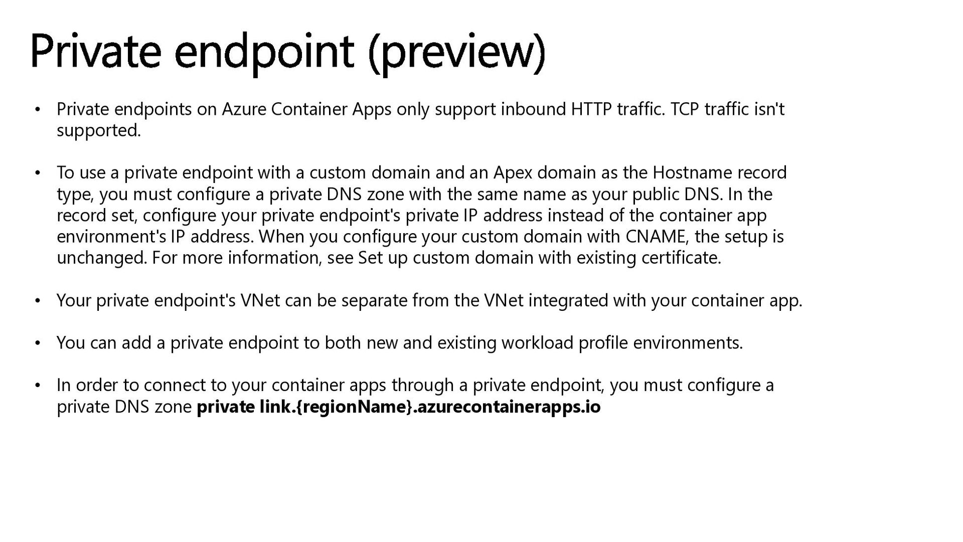 HTTP traffic. TCP traffic isn't supported. • To use a private endpoint with a custom domain and an Apex domain as the Hostname record type, you must configure a private DNS zone with the same name as your public DNS. In the record set, configure your private endpoint's private IP address instead of the container app environment's IP address. When you configure your custom domain with CNAME, the setup is unchanged. For more information, see Set up custom domain with existing certificate. • Your private endpoint's VNet can be separate from the VNet integrated with your container app. • You can add a private endpoint to both new and existing workload profile environments. • In order to connect to your container apps through a private endpoint, you must configure a private DNS zone private link.{regionName}.azurecontainerapps.io Private endpoint (preview)