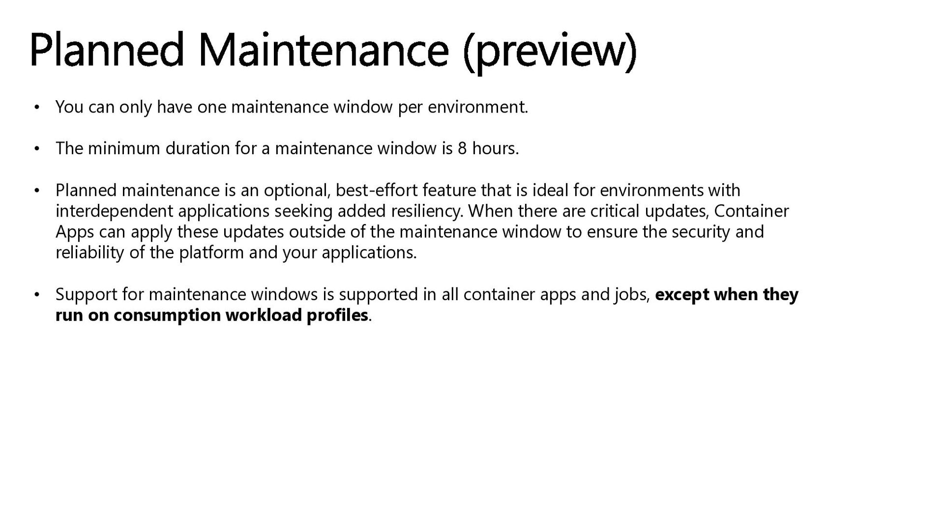 • The minimum duration for a maintenance window is 8 hours. • Planned maintenance is an optional, best-effort feature that is ideal for environments with interdependent applications seeking added resiliency. When there are critical updates, Container Apps can apply these updates outside of the maintenance window to ensure the security and reliability of the platform and your applications. • Support for maintenance windows is supported in all container apps and jobs, except when they run on consumption workload profiles. Planned Maintenance (preview)