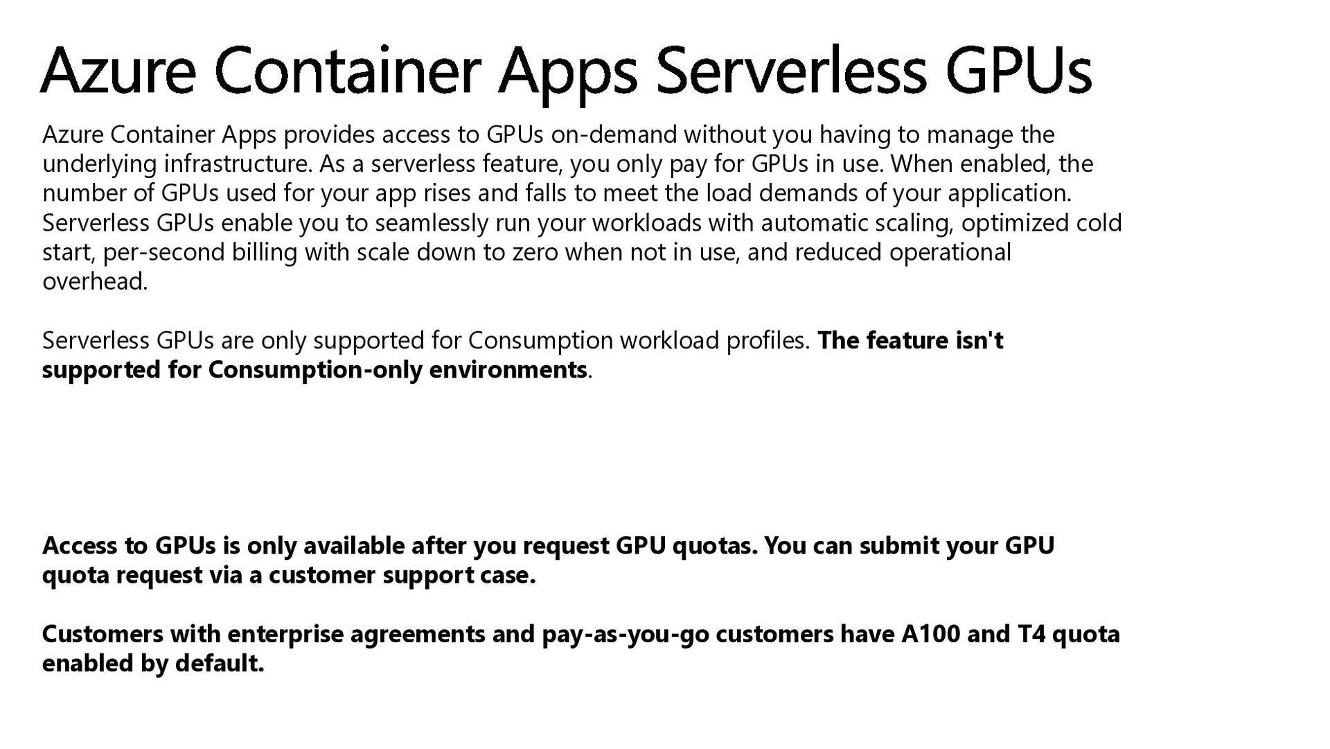 having to manage the underlying infrastructure. As a serverless feature, you only pay for GPUs in use. When enabled, the number of GPUs used for your app rises and falls to meet the load demands of your application. Serverless GPUs enable you to seamlessly run your workloads with automatic scaling, optimized cold start, per-second billing with scale down to zero when not in use, and reduced operational overhead. Serverless GPUs are only supported for Consumption workload profiles. The feature isn't supported for Consumption-only environments. Access to GPUs is only available after you request GPU quotas. You can submit your GPU quota request via a customer support case. Customers with enterprise agreements and pay-as-you-go customers have A100 and T4 quota enabled by default. Azure Container Apps Serverless GPUs