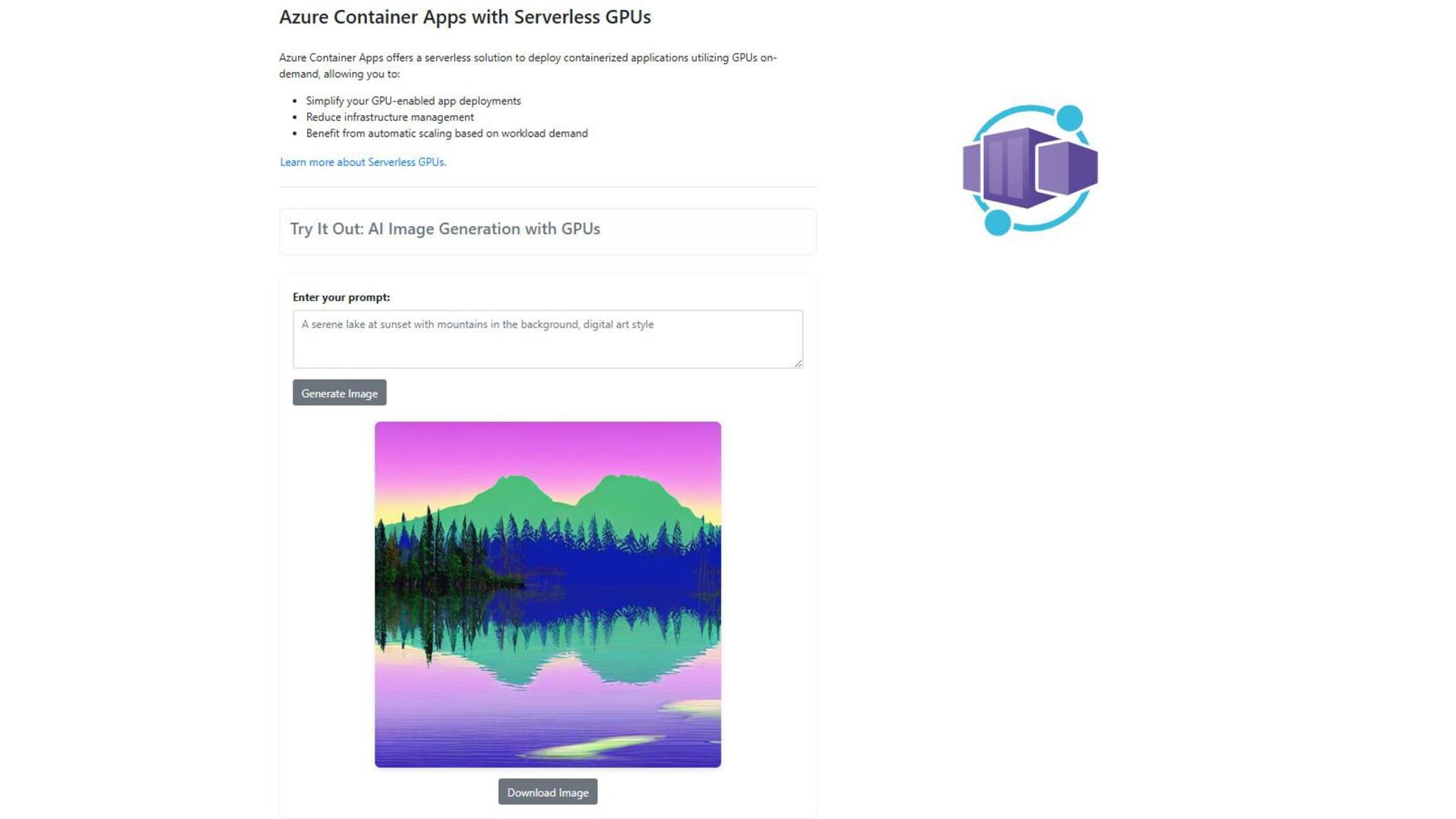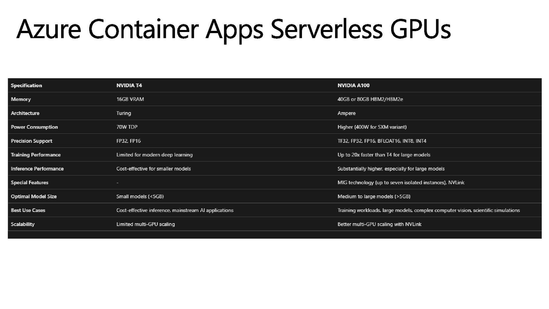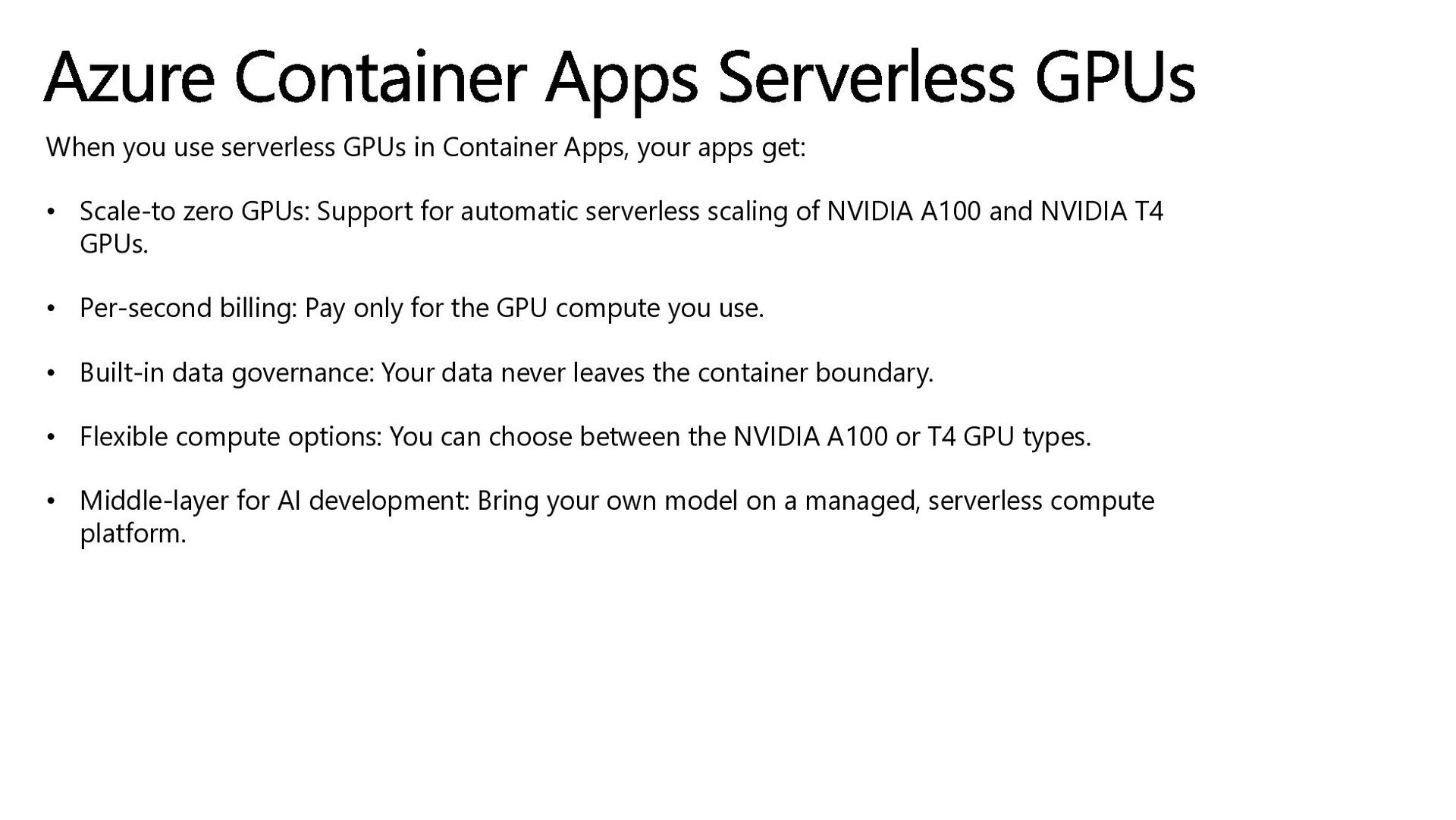 get: • Scale-to zero GPUs: Support for automatic serverless scaling of NVIDIA A100 and NVIDIA T4 GPUs. • Per-second billing: Pay only for the GPU compute you use. • Built-in data governance: Your data never leaves the container boundary. • Flexible compute options: You can choose between the NVIDIA A100 or T4 GPU types. • Middle-layer for AI development: Bring your own model on a managed, serverless compute platform. Azure Container Apps Serverless GPUs