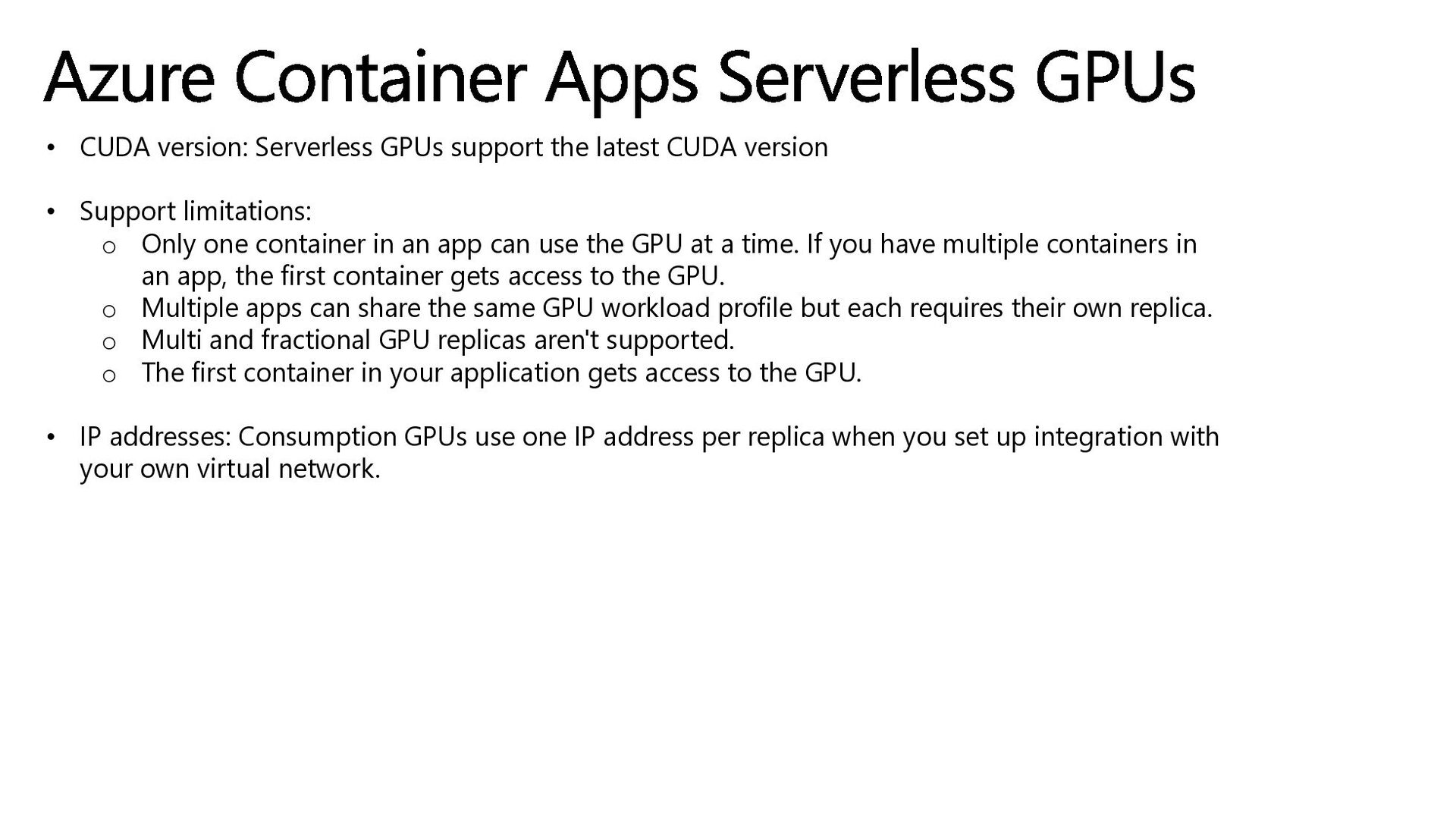 • Support limitations: o Only one container in an app can use the GPU at a time. If you have multiple containers in an app, the first container gets access to the GPU. o Multiple apps can share the same GPU workload profile but each requires their own replica. o Multi and fractional GPU replicas aren't supported. o The first container in your application gets access to the GPU. • IP addresses: Consumption GPUs use one IP address per replica when you set up integration with your own virtual network. Azure Container Apps Serverless GPUs
