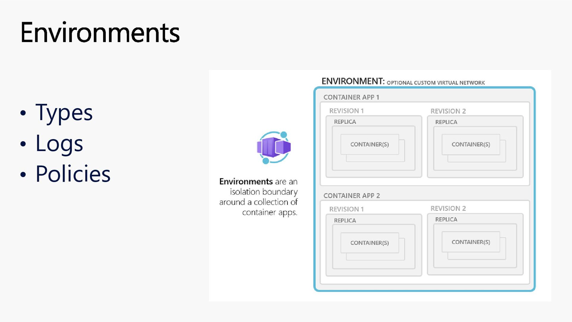 platform and infrastructure updates are regularly and automatically applied to both components and environments. The Container Apps update system is designed to minimize the effect on performance of your apps during updates. By defining maintenance windows, you can designate the most advantageous times for your application. • Defining a maintenance window allows you to decide the range of time when noncritical updates are applied to your Container Apps environment. Planned Maintenance (preview) Update type Description Timing Critical Urgent fixes that include updates essential to the security and stability of your app. Anytime Noncritical Routine security patches, bug fixes, and the introduction of new features. If a planned maintenance window is defined, then updates only start during that time span. If a maintenance window isn't configured, then updates can be applied at any time.