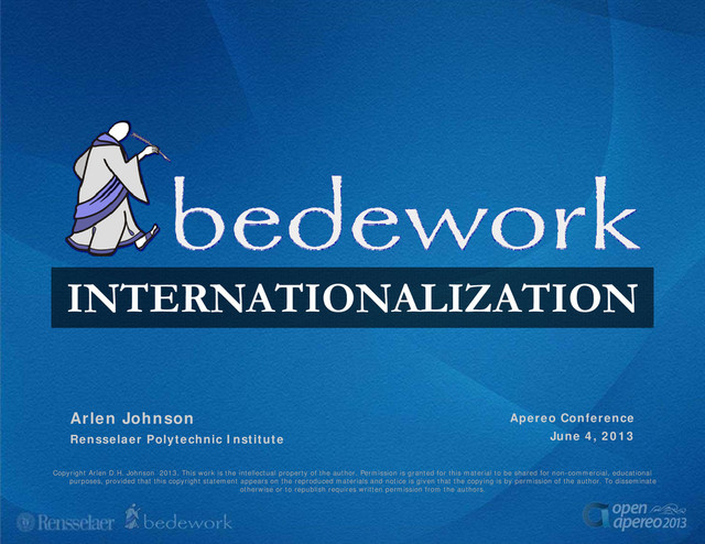 intellectual property of the author. Permission is granted for this material to be shared for non-commercial, educational purposes, provided that this copyright statement appears on the reproduced materials and notice is given that the copying is by permission of the author. To disseminate otherwise or to republish requires written permission from the authors. Arlen Johnson Rensselaer Polytechnic Institute Apereo Conference June 4, 2013
