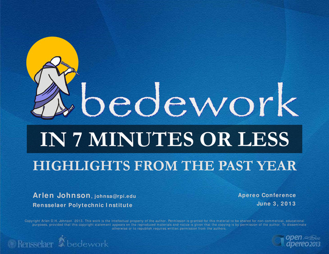 This work is the intellectual property of the author. Permission is granted for this material to be shared for non-commercial, educational purposes, provided that this copyright statement appears on the reproduced materials and notice is given that the copying is by permission of the author. To disseminate otherwise or to republish requires written permission from the authors. Arlen Johnson, [email protected] Rensselaer Polytechnic Institute Apereo Conference June 3, 2013 HIGHLIGHTS FROM THE PAST YEAR