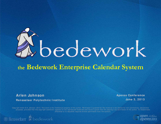 Bedework is an open-source, standards-compliant calendar system that supports public, personal, and group calendaring. Since its first release in 2006, Bedework has been adopted by numerous public and private organizations both large and small. A core mission of Bedework is interoperability between calendar systems, clients, and devices. Bedework consists of a core calendaring engine, CalDAV server, CardDAV server, synchronization engine and a Timezone server. It comes with web clients for public events and public events administration, personal calendaring, public event submission, event registration, a client to build data feeds and widgets, and supports web services (SOAP and REST). Bedework 3.9 introduces many new features: interoperable calendar sharing; a simple subscription system for public events; an event registration system; management of theme resources for public events; image uploads for public events; Solr driven public events listings and paging; enhancements to data feeds and event widgets. This talk will demonstrate Bedework's latest features and plans for development, touching on the progress of calendaring standards along the way.