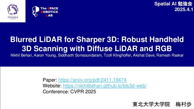 CVPR 2025で発表が予定されている"Blurred LiDAR for Sharper 3D: Robust Handheld 3D Scanning with Diffuse LiDAR and RGB"の論文の内容をまとめたスライドです。