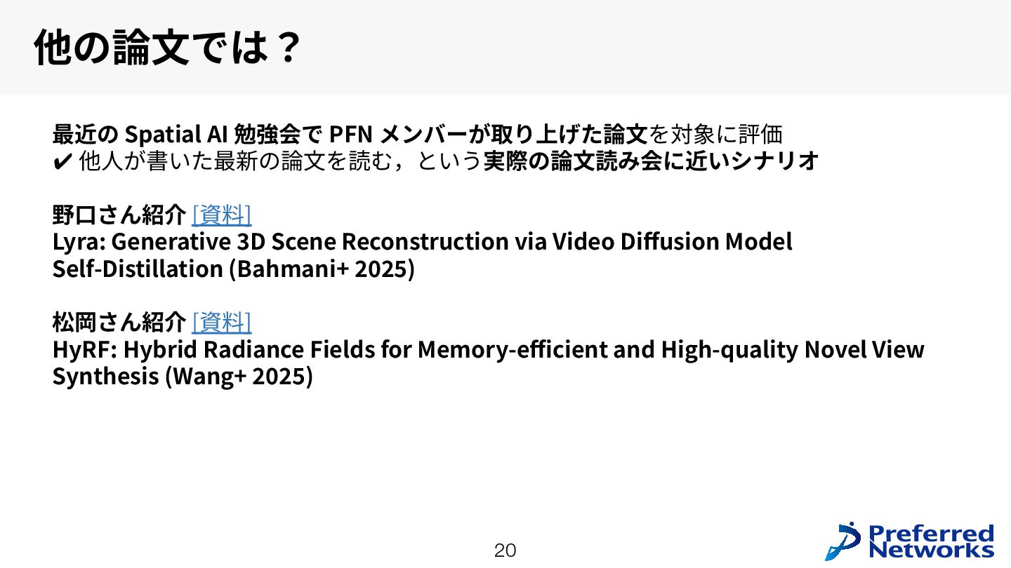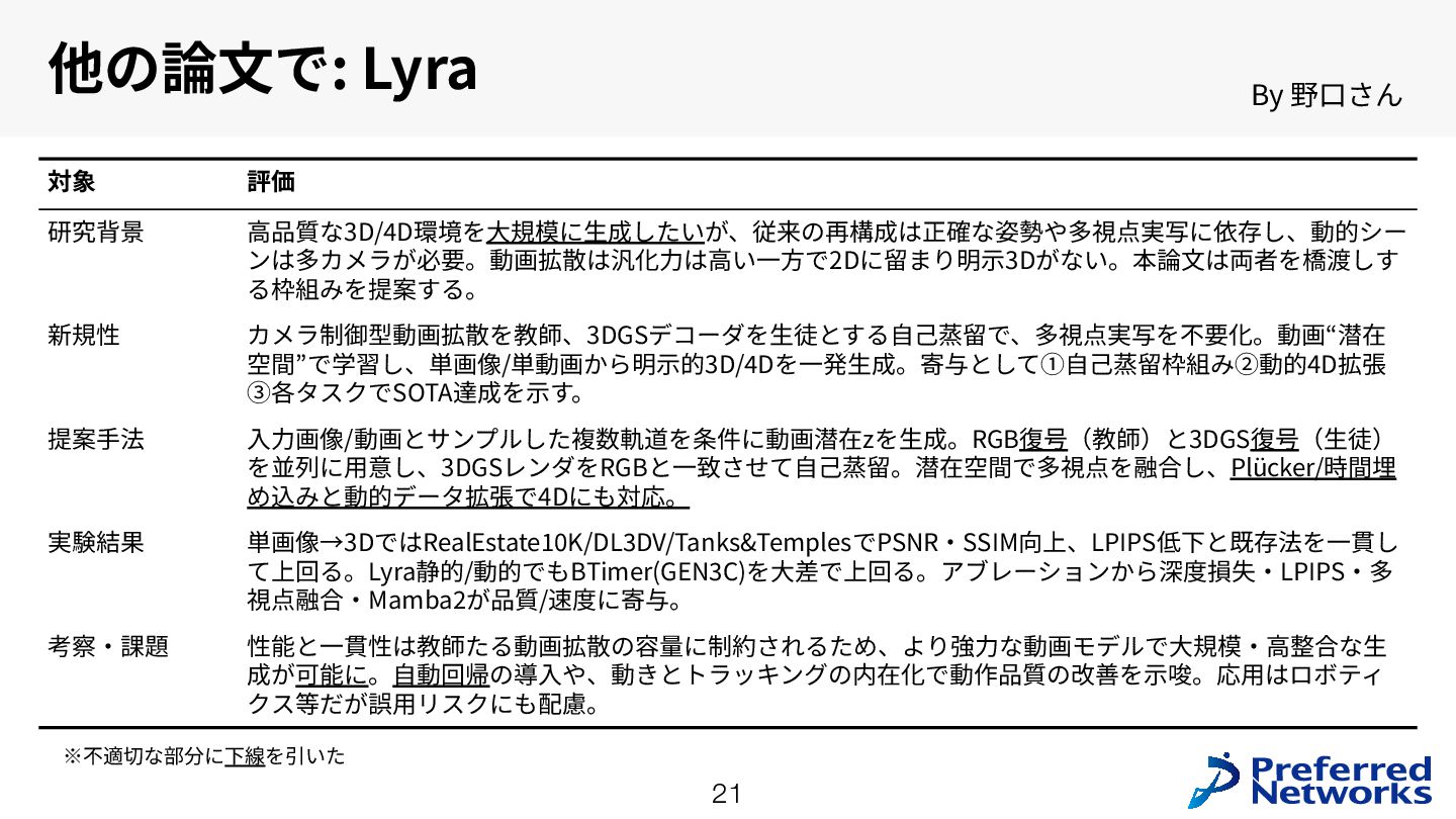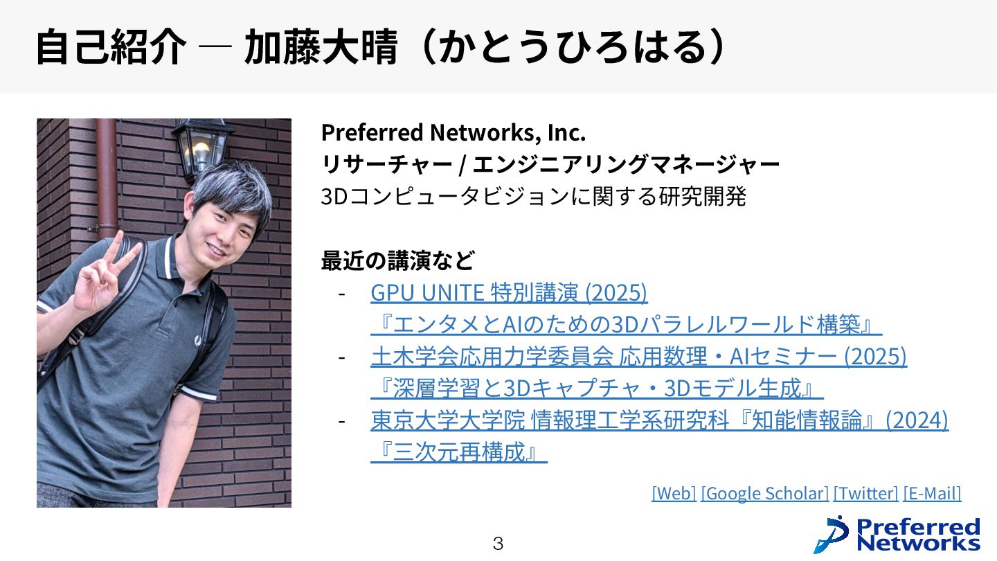 - エンタメとAIのための3Dパラレルワールド構築(GPU UNITE 2025 特別講演) https://speakerdeck.com/pfn/20251015-gpu-unite-2025-pfn-3d-parallel-world