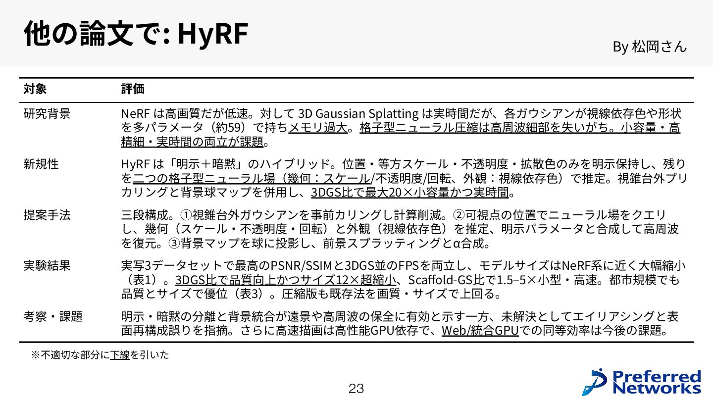 - HyRF: Hybrid Radiance Fields for Memory-efficient and High-quality Novel View Synthesis https://speakerdeck.com/spatial_ai_network/hyrf-hybrid-radiance-fields-for-novel-view-synthesis