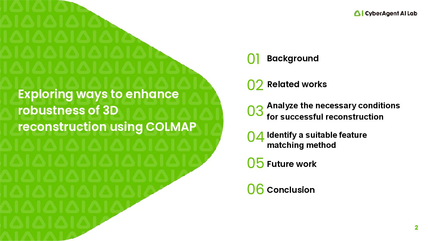 COLMAP Background 01 Related works 02 Analyze the necessary conditions for successful reconstruction 03 Identify a suitable feature matching method 04 Future work 05 Conclusion 06
