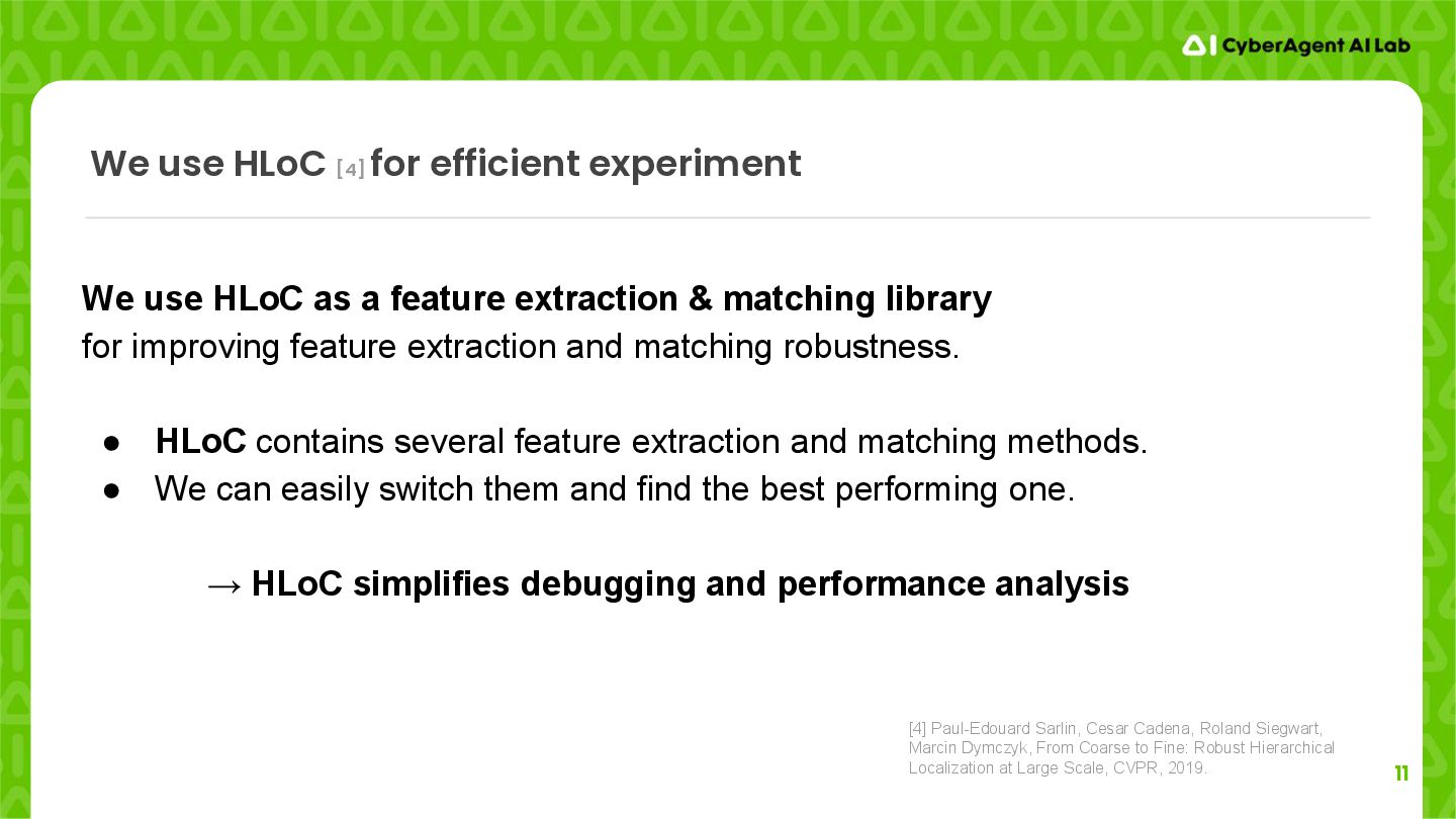 Sarlin, Cesar Cadena, Roland Siegwart, Marcin Dymczyk, From Coarse to Fine: Robust Hierarchical Localization at Large Scale, CVPR, 2019. We use HLoC as a feature extraction & matching library for improving feature extraction and matching robustness. • HLoC contains several feature extraction and matching methods. • We can easily switch them and find the best performing one. → HLoC simplifies debugging and performance analysis