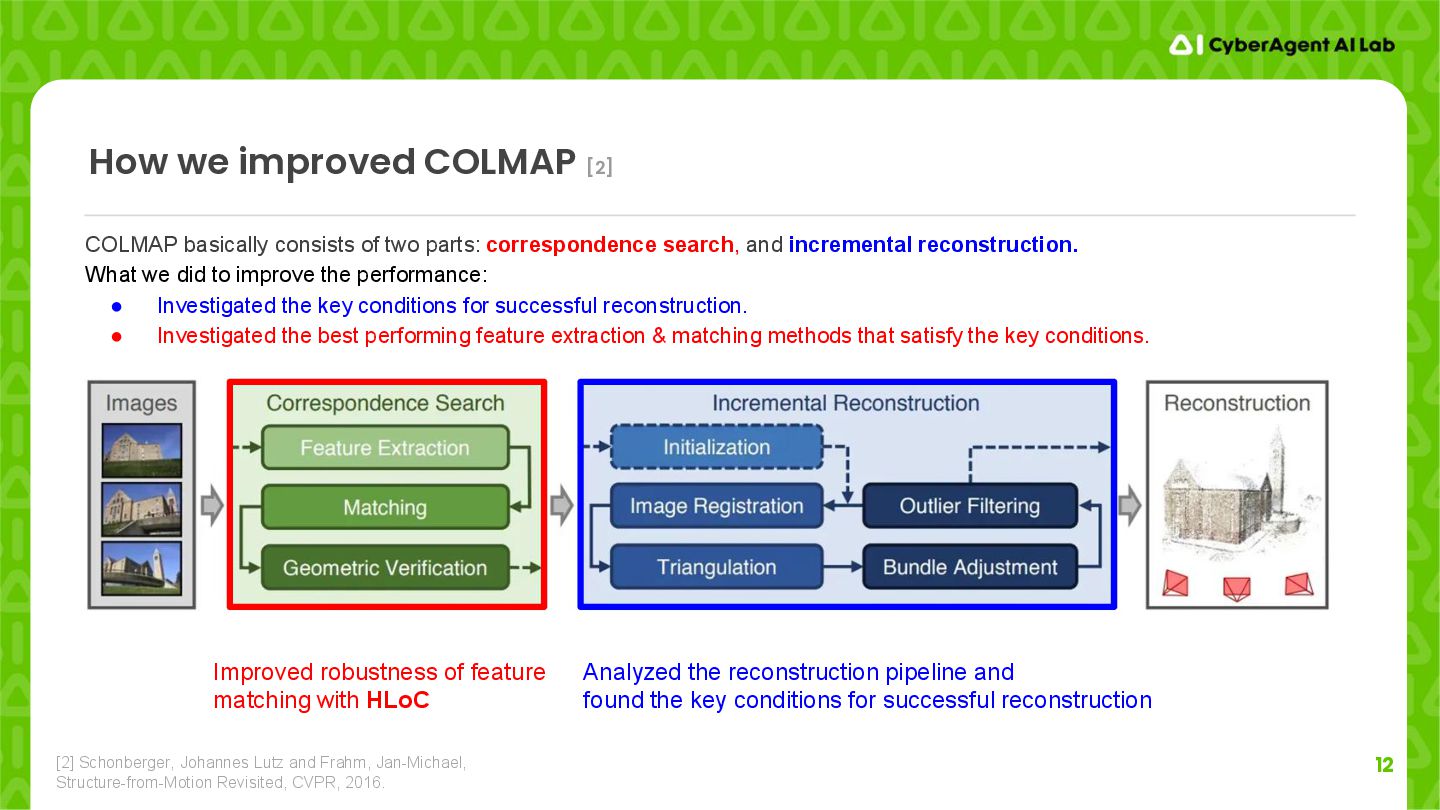 10. 12 How we improved COLMAP [2] COLMAP basically consists of