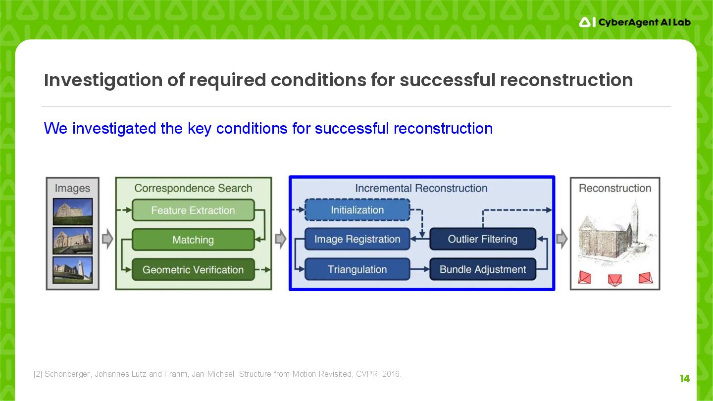 Johannes Lutz and Frahm, Jan-Michael, Structure-from-Motion Revisited, CVPR, 2016. We investigated the key conditions for successful reconstruction