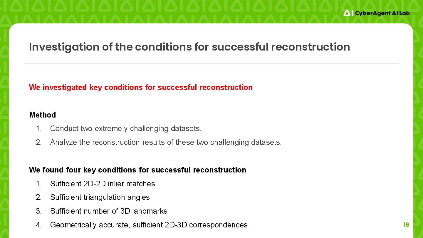 key conditions for successful reconstruction Method 1. Conduct two extremely challenging datasets. 2. Analyze the reconstruction results of these two challenging datasets. We found four key conditions for successful reconstruction 1. Sufficient 2D-2D inlier matches 2. Sufficient triangulation angles 3. Sufficient number of 3D landmarks 4. Geometrically accurate, sufficient 2D-3D correspondences
