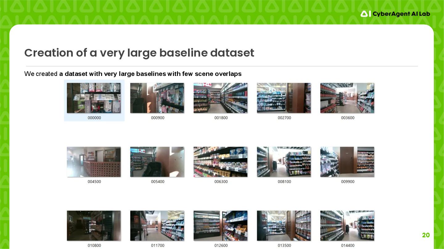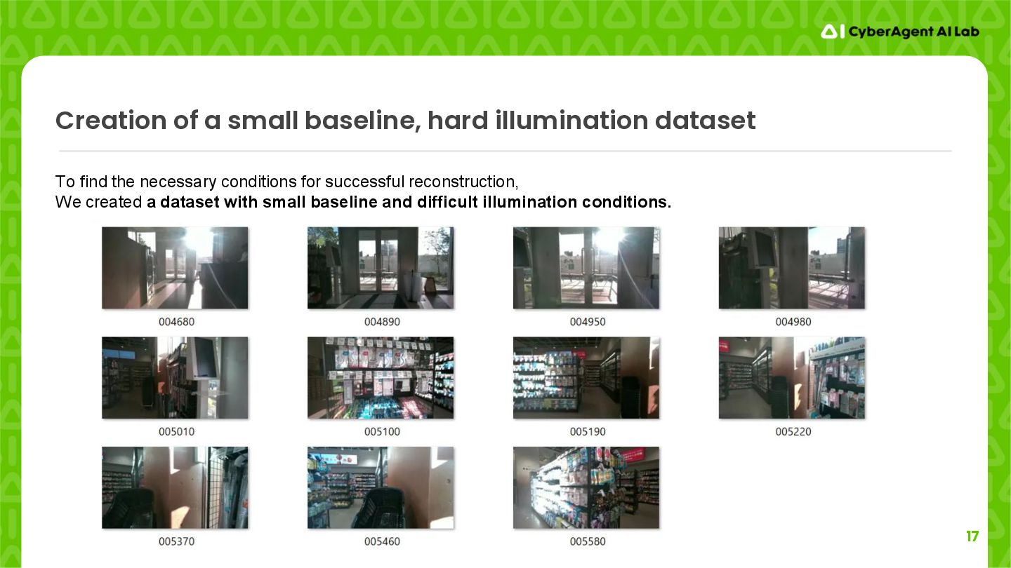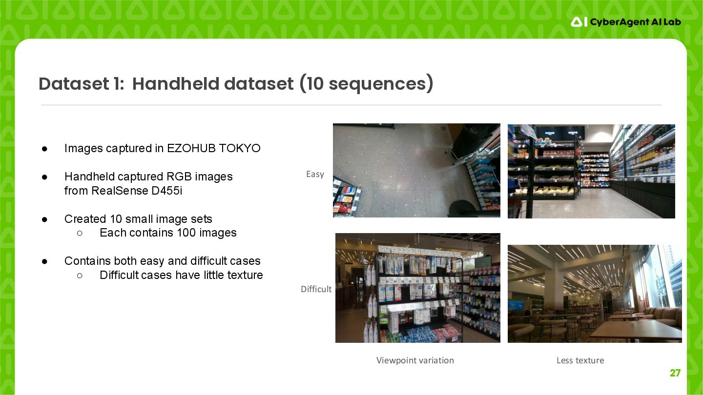 in EZOHUB TOKYO • Handheld captured RGB images from RealSense D455i • Created 10 small image sets ◦ Each contains 100 images • Contains both easy and difficult cases ◦ Difficult cases have little texture Easy Difficult Viewpoint variation Less texture