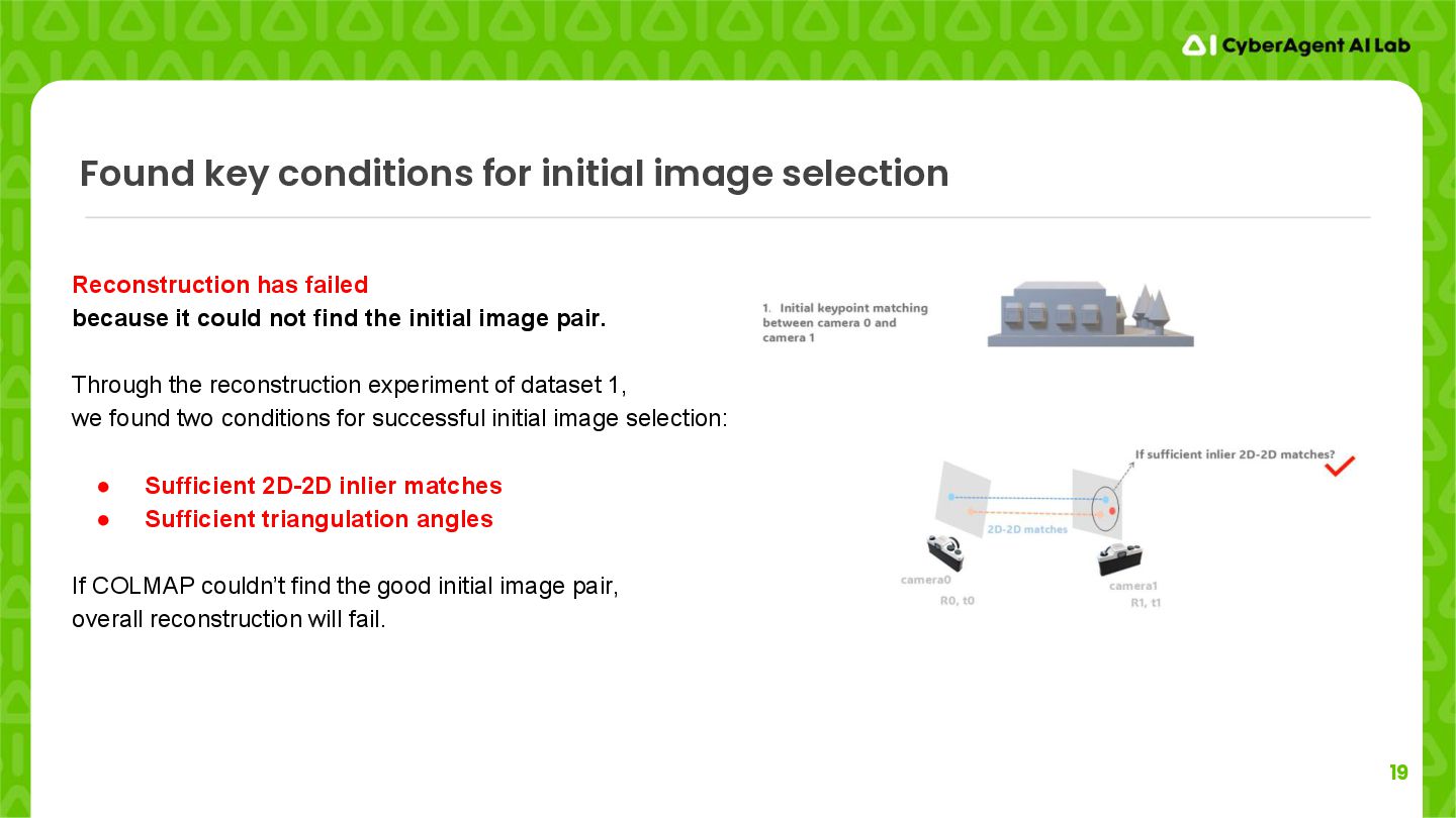 failed because it could not find the initial image pair. Through the reconstruction experiment of dataset 1, we found two conditions for successful initial image selection: • Sufficient 2D-2D inlier matches • Sufficient triangulation angles If COLMAP couldn’t find the good initial image pair, overall reconstruction will fail.