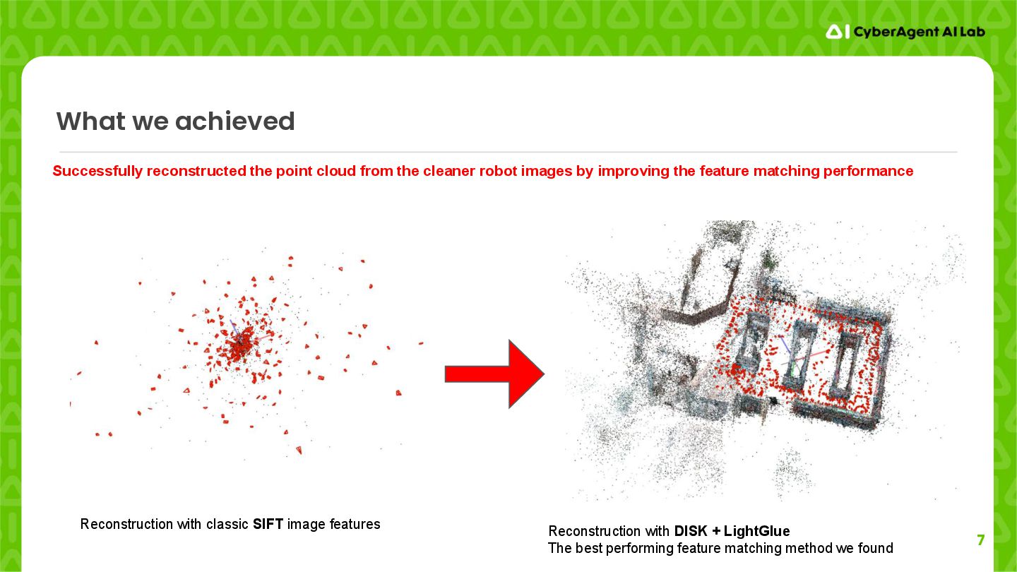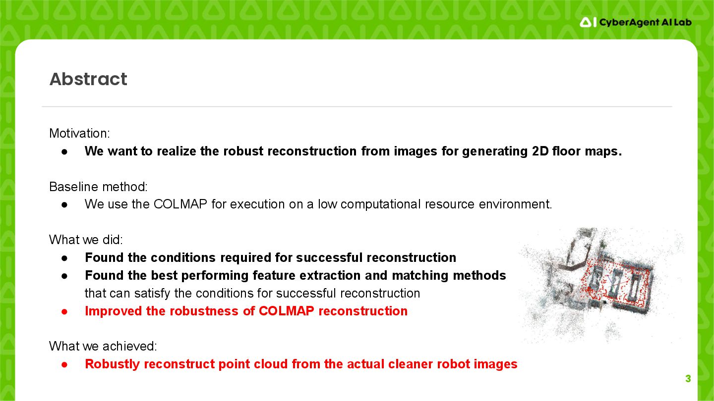 reconstruction from images for generating 2D floor maps. Baseline method: • We use the COLMAP for execution on a low computational resource environment. What we did: • Found the conditions required for successful reconstruction • Found the best performing feature extraction and matching methods that can satisfy the conditions for successful reconstruction • Improved the robustness of COLMAP reconstruction What we achieved: • Robustly reconstruct point cloud from the actual cleaner robot images