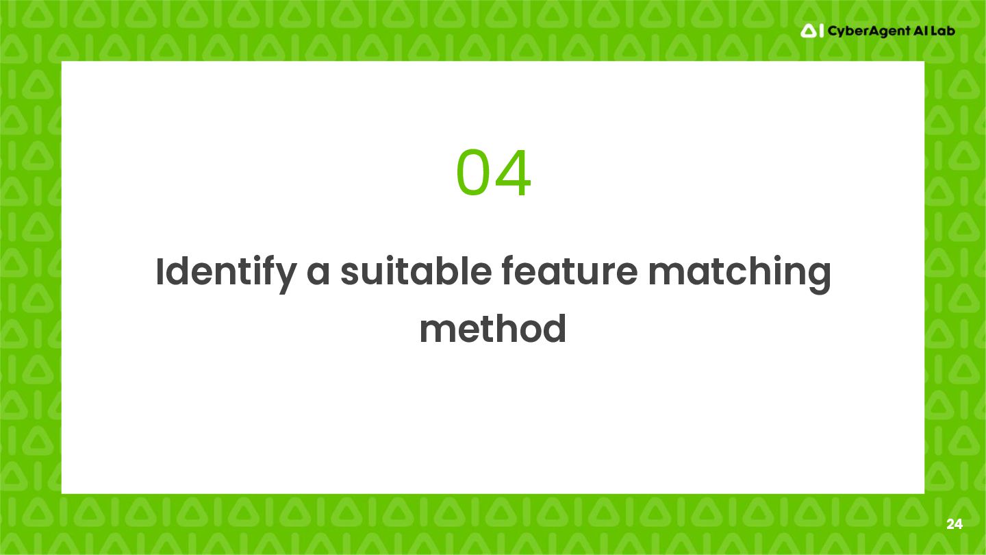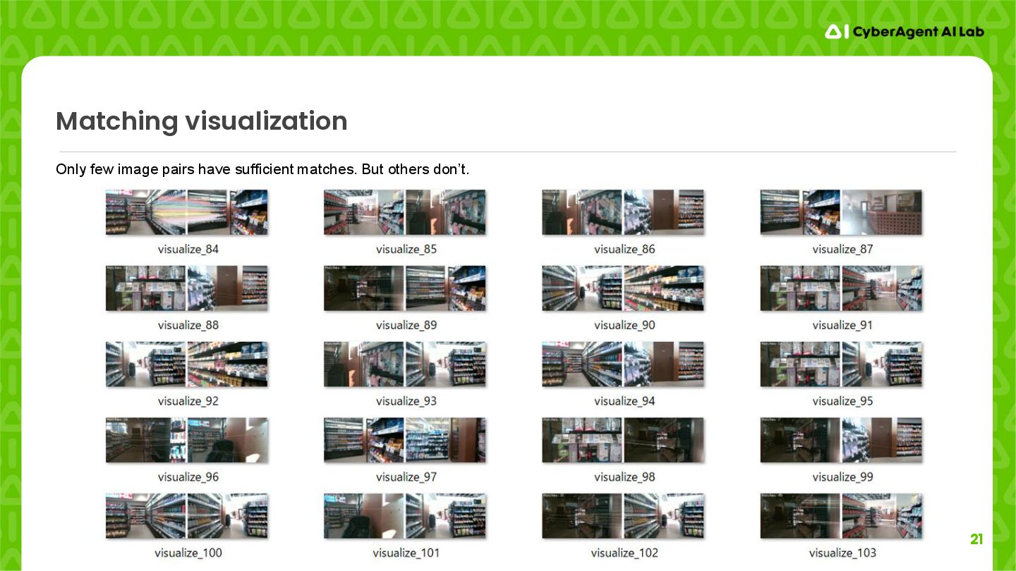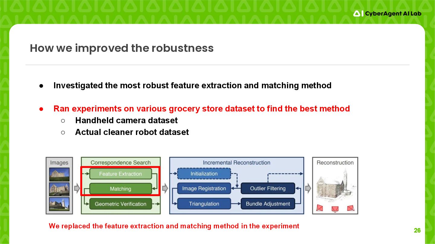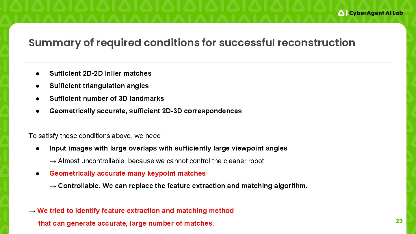 2D-2D inlier matches • Sufficient triangulation angles • Sufficient number of 3D landmarks • Geometrically accurate, sufficient 2D-3D correspondences To satisfy these conditions above, we need • Input images with large overlaps with sufficiently large viewpoint angles → Almost uncontrollable, because we cannot control the cleaner robot • Geometrically accurate many keypoint matches → Controllable. We can replace the feature extraction and matching algorithm. → We tried to identify feature extraction and matching method that can generate accurate, large number of matches.