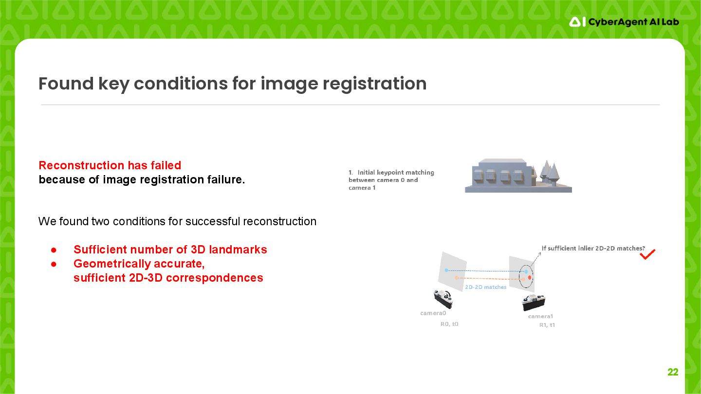 because of image registration failure. We found two conditions for successful reconstruction • Sufficient number of 3D landmarks • Geometrically accurate, sufficient 2D-3D correspondences