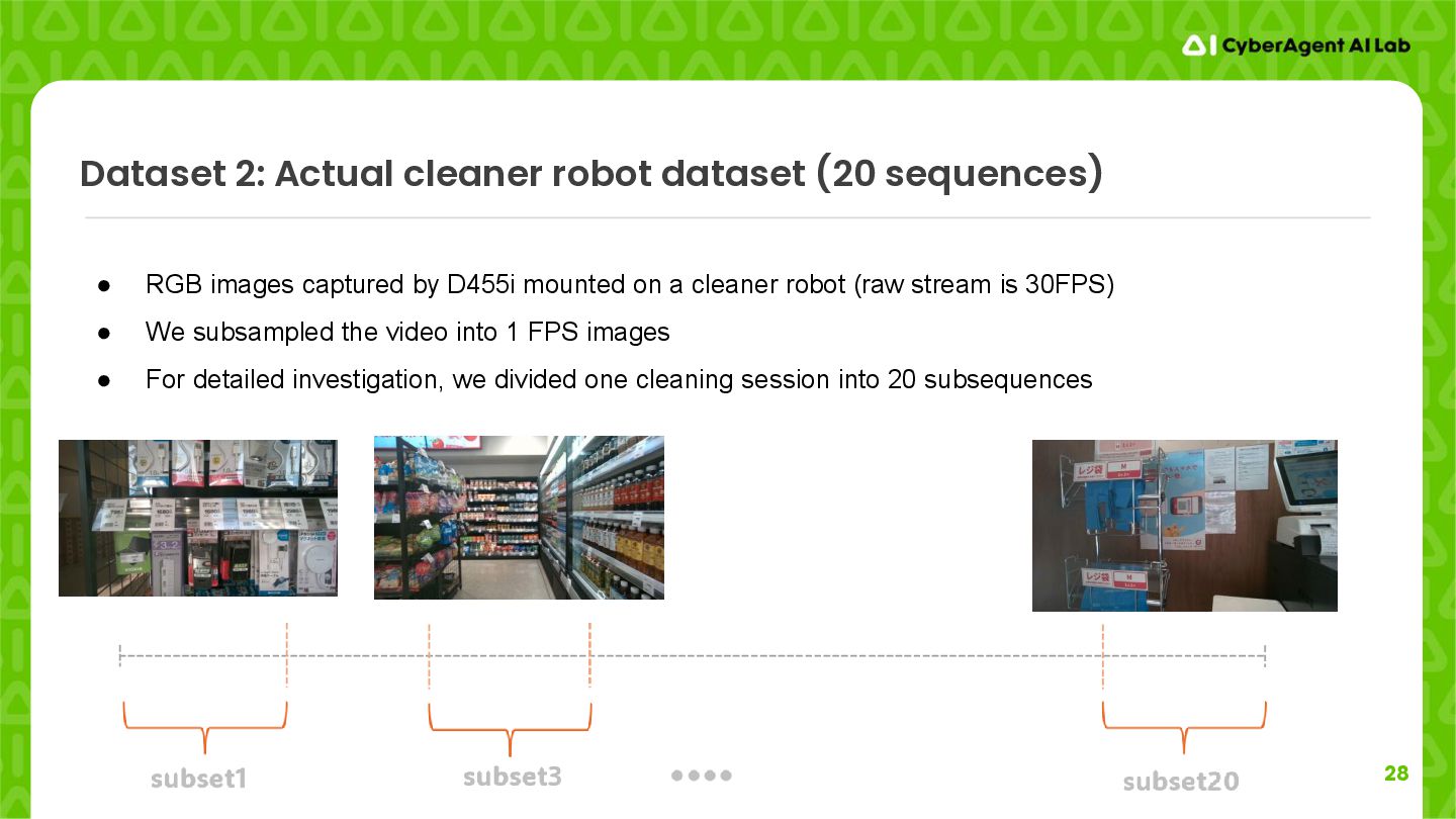 RGB images captured by D455i mounted on a cleaner robot (raw stream is 30FPS) • We subsampled the video into 1 FPS images • For detailed investigation, we divided one cleaning session into 20 subsequences