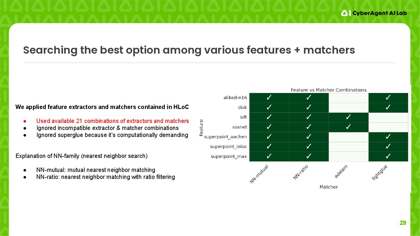 We applied feature extractors and matchers contained in HLoC • Used available 21 combinations of extractors and matchers • Ignored incompatible extractor & matcher combinations • Ignored superglue because it’s computationally demanding Explanation of NN-family (nearest neighbor search) • NN-mutual: mutual nearest neighbor matching • NN-ratio: nearest neighbor matching with ratio filtering