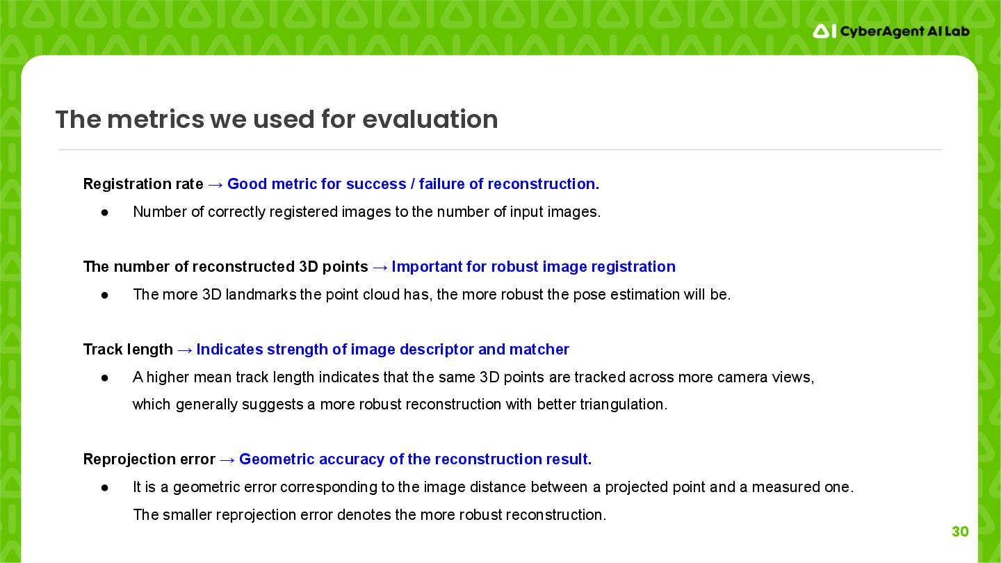 Good metric for success / failure of reconstruction. • Number of correctly registered images to the number of input images. The number of reconstructed 3D points → Important for robust image registration • The more 3D landmarks the point cloud has, the more robust the pose estimation will be. Track length → Indicates strength of image descriptor and matcher • A higher mean track length indicates that the same 3D points are tracked across more camera views, which generally suggests a more robust reconstruction with better triangulation. Reprojection error → Geometric accuracy of the reconstruction result. • It is a geometric error corresponding to the image distance between a projected point and a measured one. The smaller reprojection error denotes the more robust reconstruction.