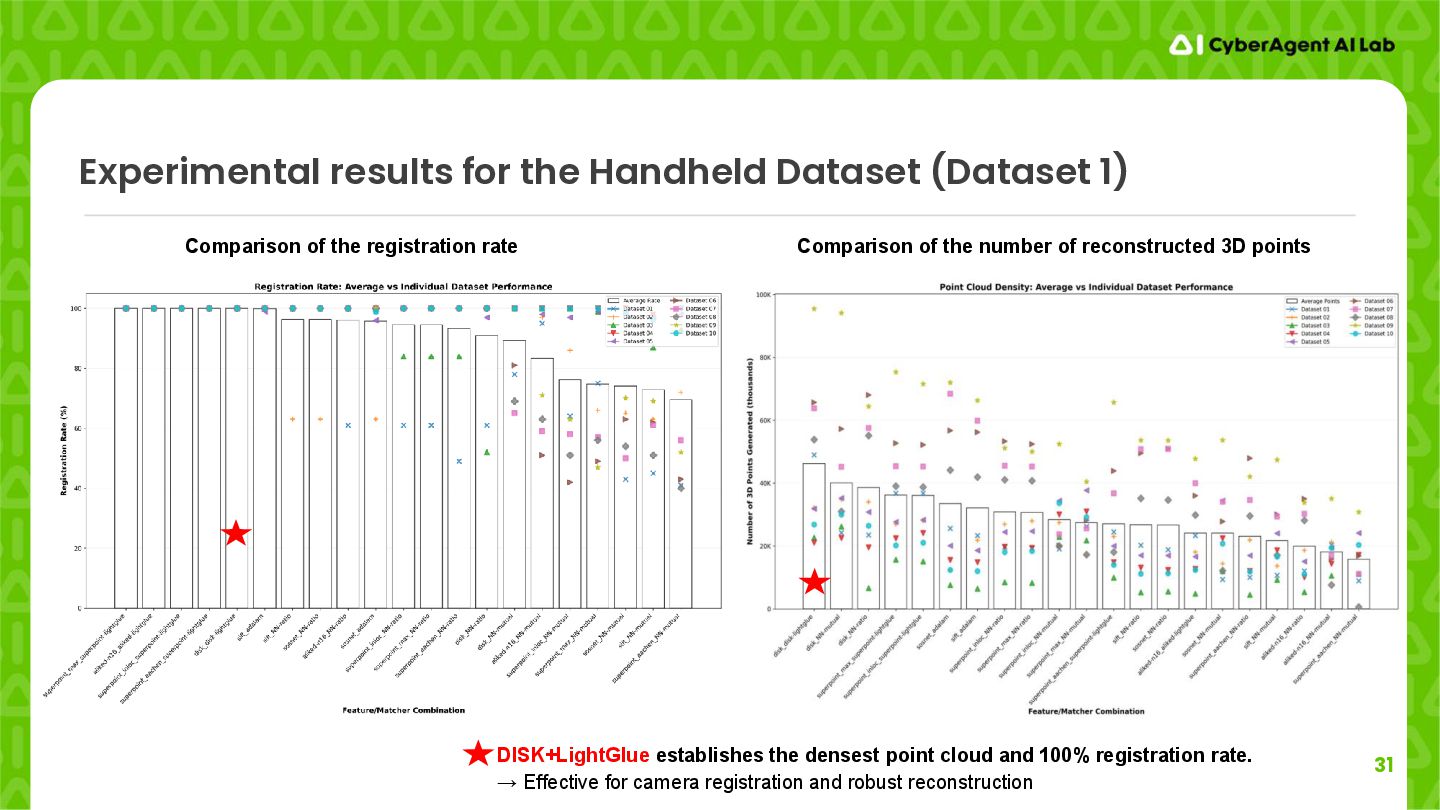 DISK+LightGlue establishes the densest point cloud. → Effective for camera registration and robust reconstruction Comparison of the registration rate Comparison of the number of reconstructed 3D points