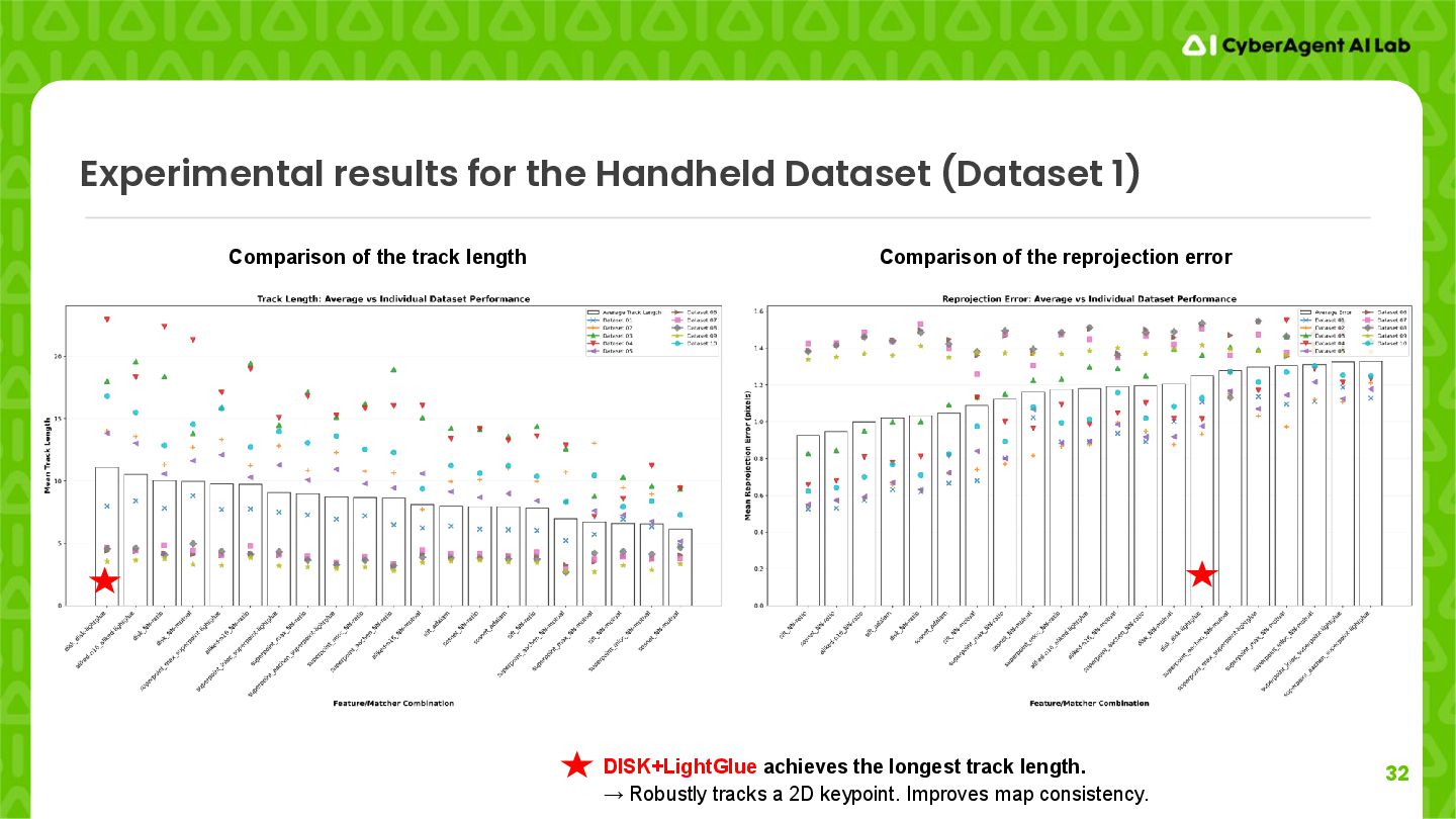 of the track length Comparison of the reprojection error DISK+LightGlue achieves the longest track length. → Robustly tracks a 2D keypoint. Improves map consistency.