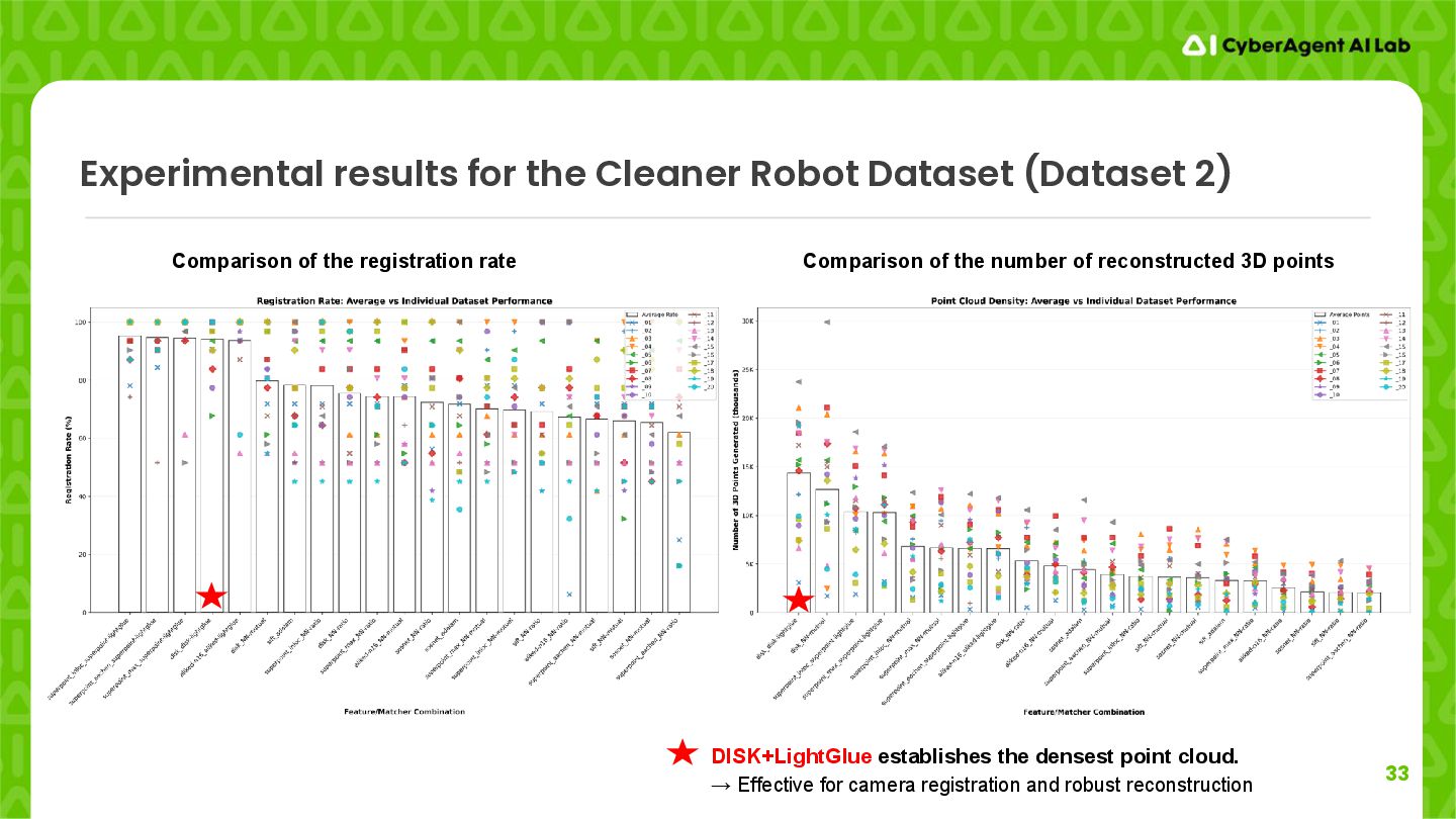 of the registration rate Comparison of the number of reconstructed 3D points DISK+LightGlue establishes the densest point cloud and 100% registration rate. → Effective for camera registration and robust reconstruction