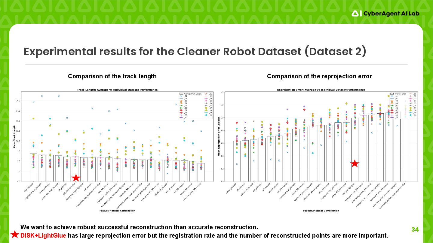 We want to achieve robust successful reconstruction than accurate reconstruction. DISK+LightGlue has large reprojection error but the registration rate and the number of reconstructed points are more important. Comparison of the track length Comparison of the reprojection error